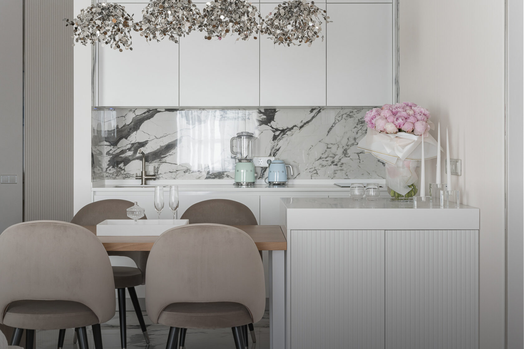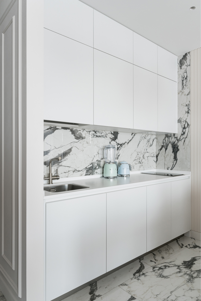 В основной части - в сердце кухни расположились фасады из МДФ в матовой эмали и столешница 24 мм из искусственного камня
