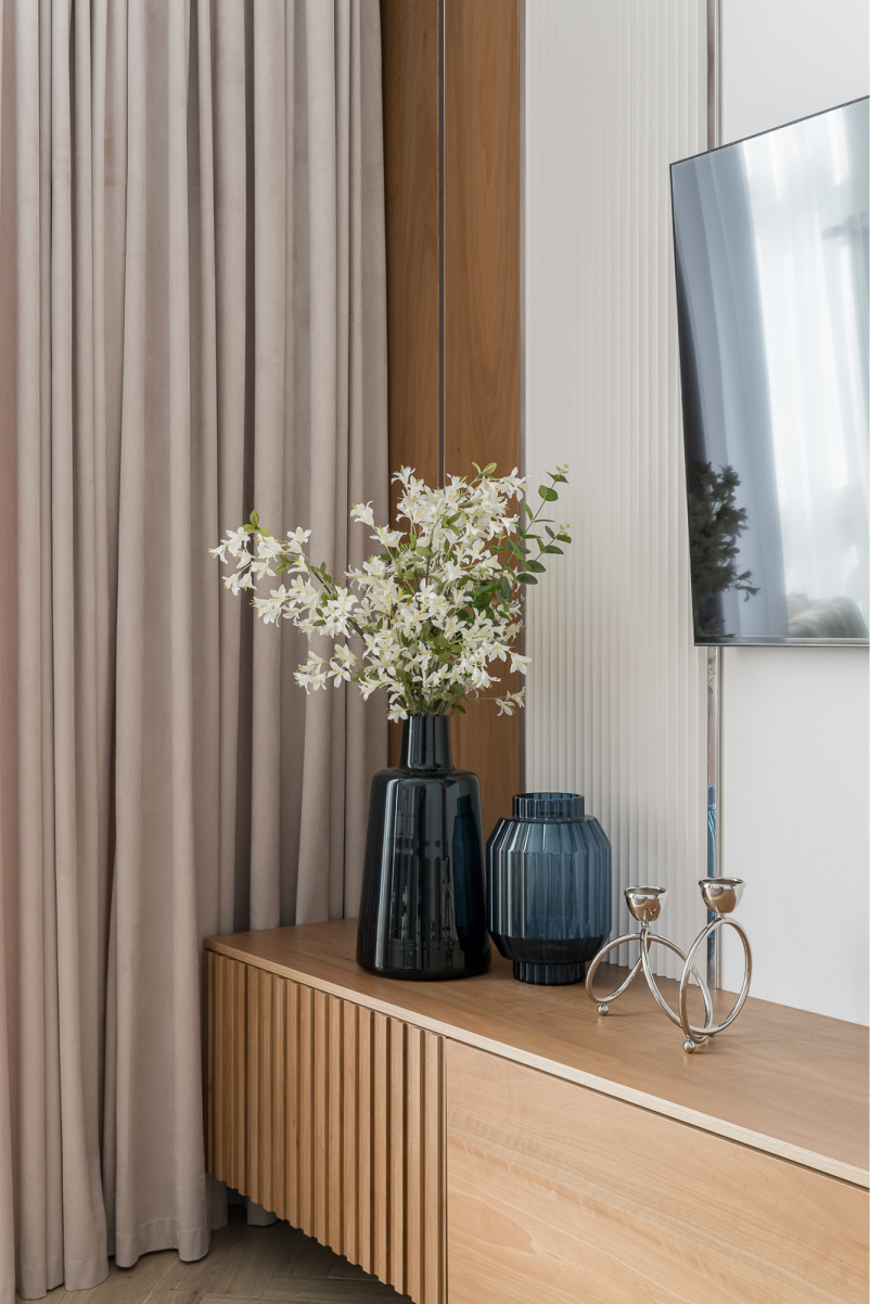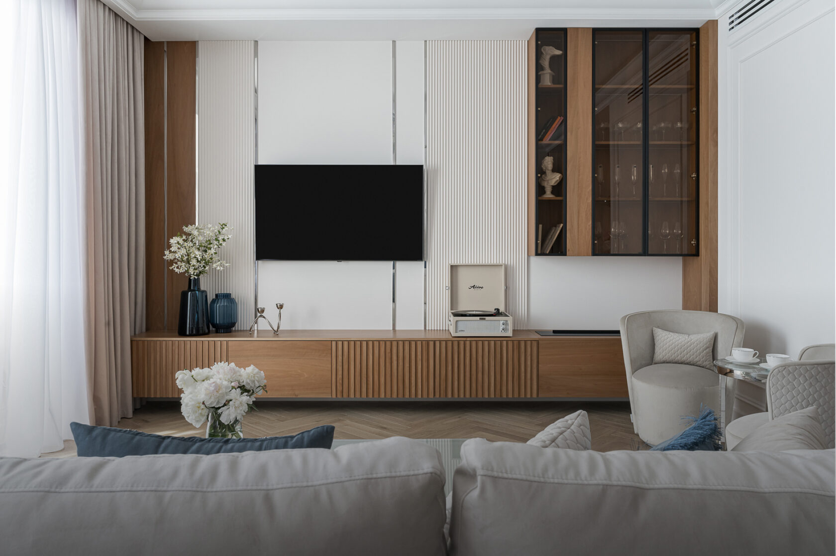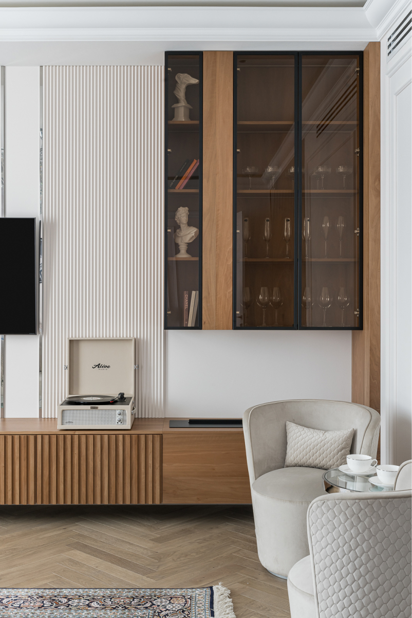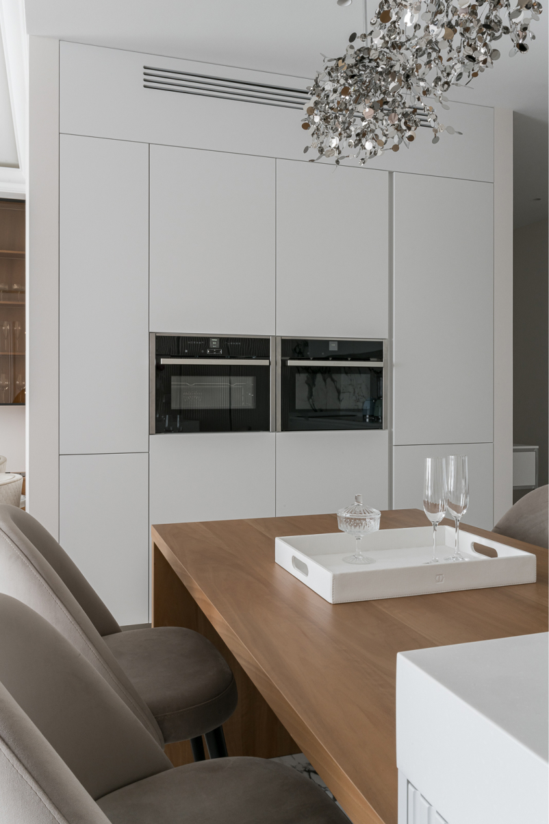 Объёмные фрезерованные фасады из шпона Орех Европейский White-Gray - эстетически красивое решение, которое добавляет декоративное разнообразие воздушному интерьеру