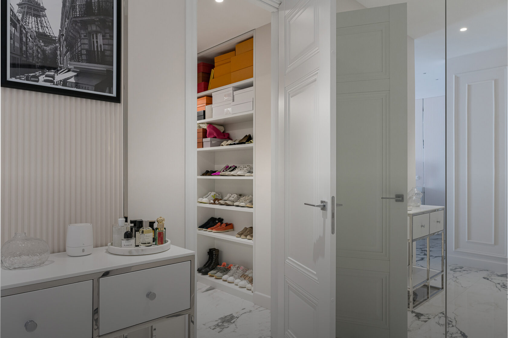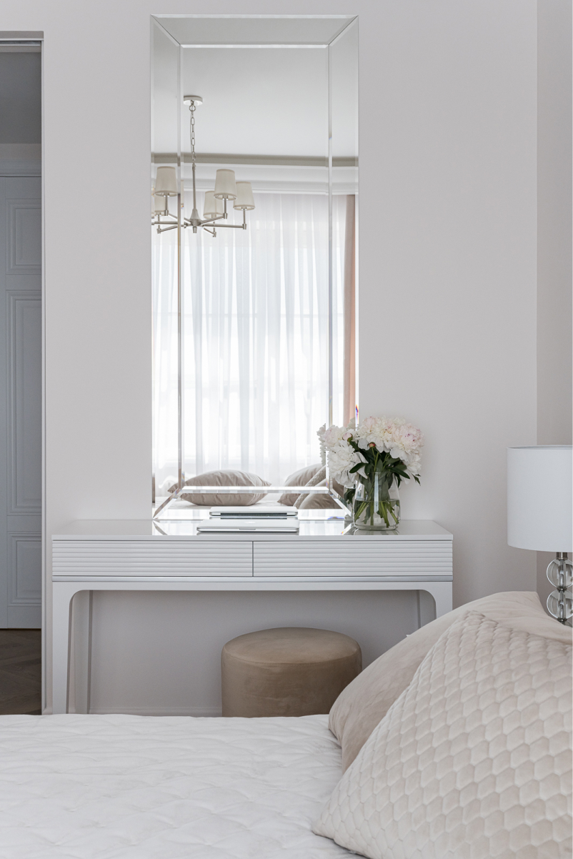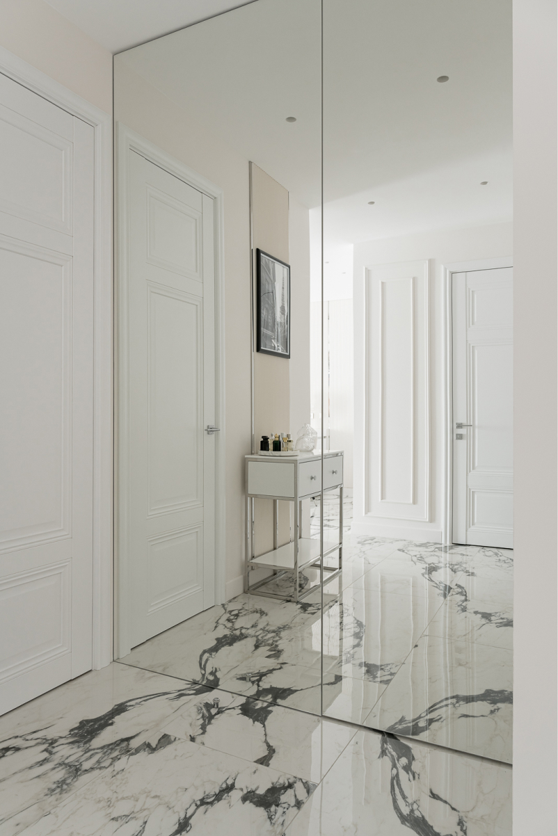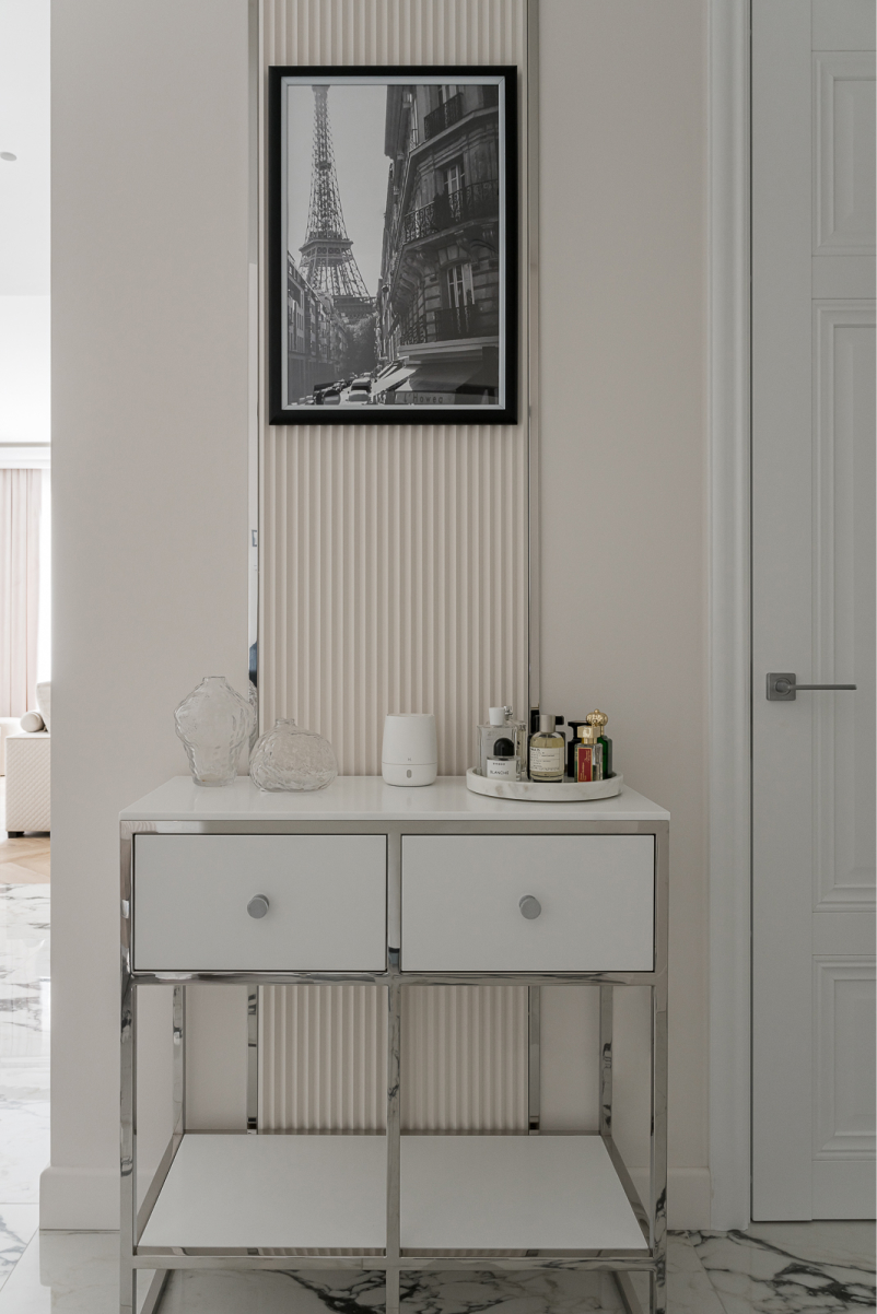 Рядом с гардеробом расположилась невероятная тумба индивидуального изготовления - столешница из искусственного камня, каркас из полированной нержавеющей стали и фасад из МДФ в матовой эмали. Здесь удобно хранить нужные мелочи и использовать место для подходящих элементов декора.