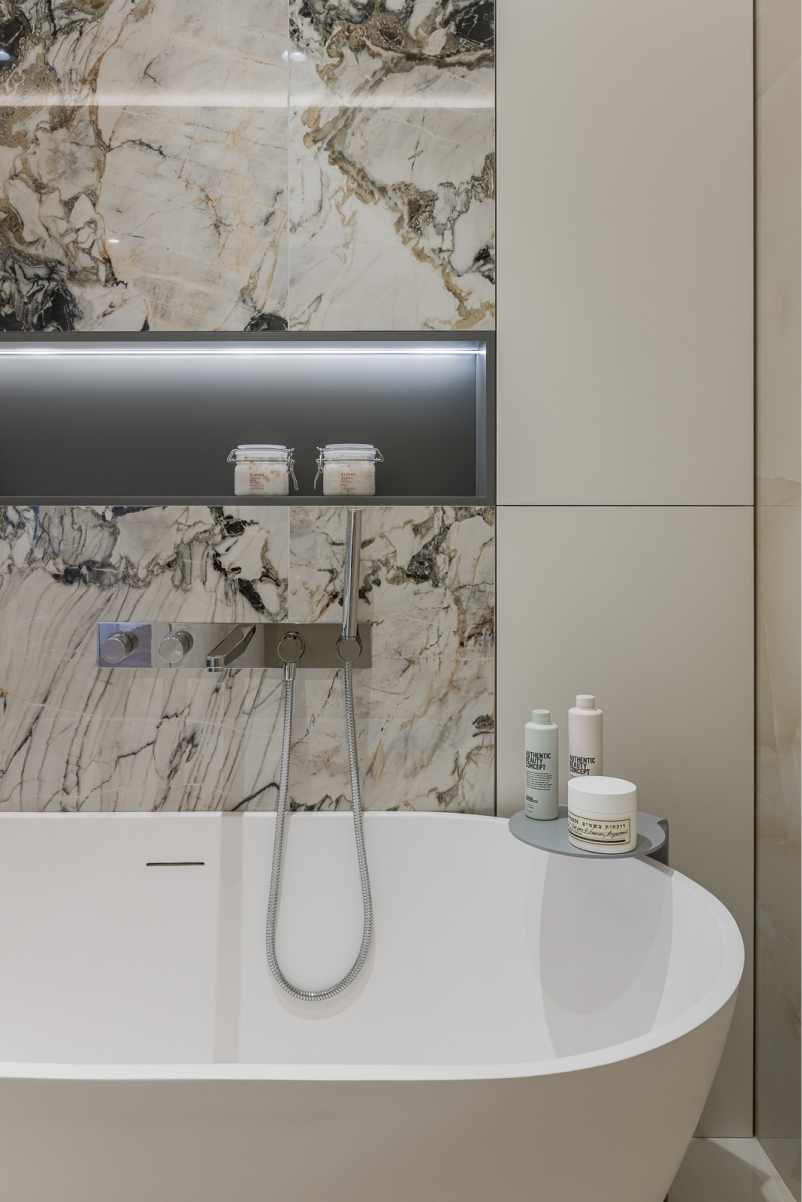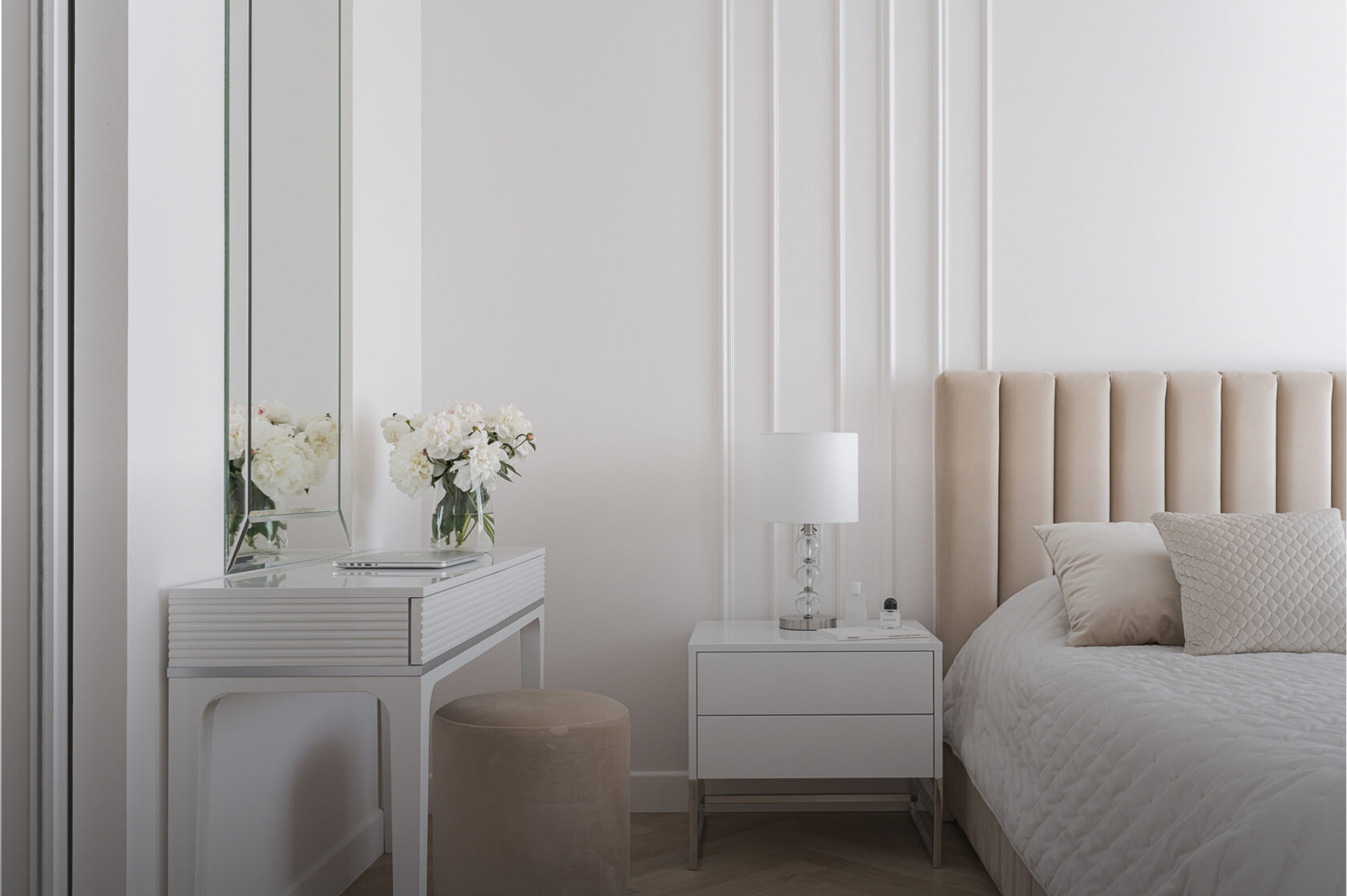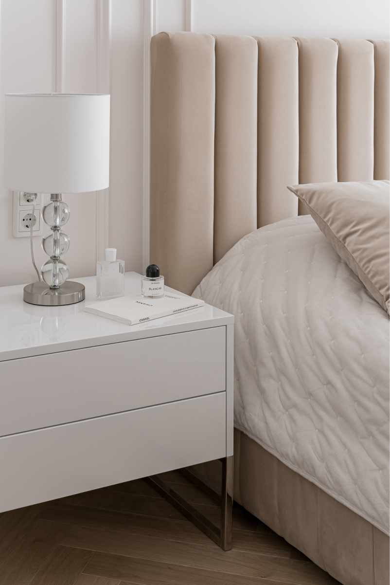 Рядом с гардеробом расположилась невероятная тумба индивидуального изготовления - столешница из искусственного камня, каркас из полированной нержавеющей стали и фасад из МДФ в матовой эмали. Здесь удобно хранить нужные мелочи и использовать место для подходящих элементов декора.