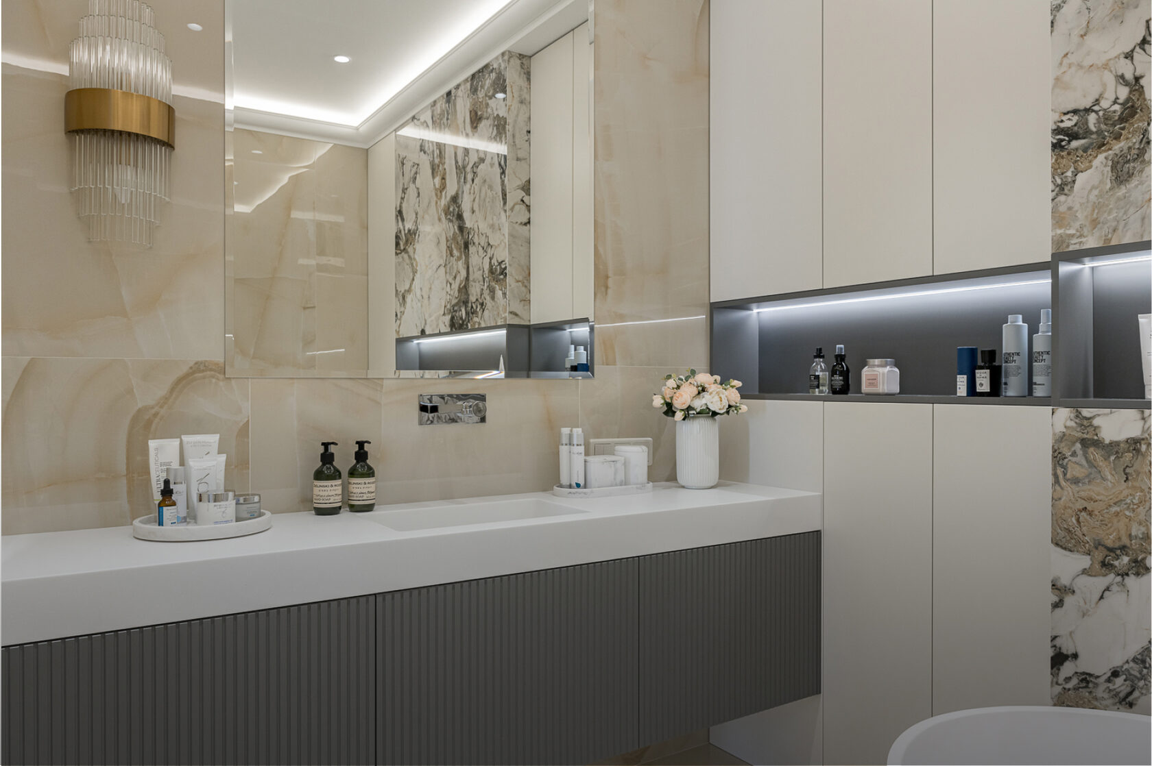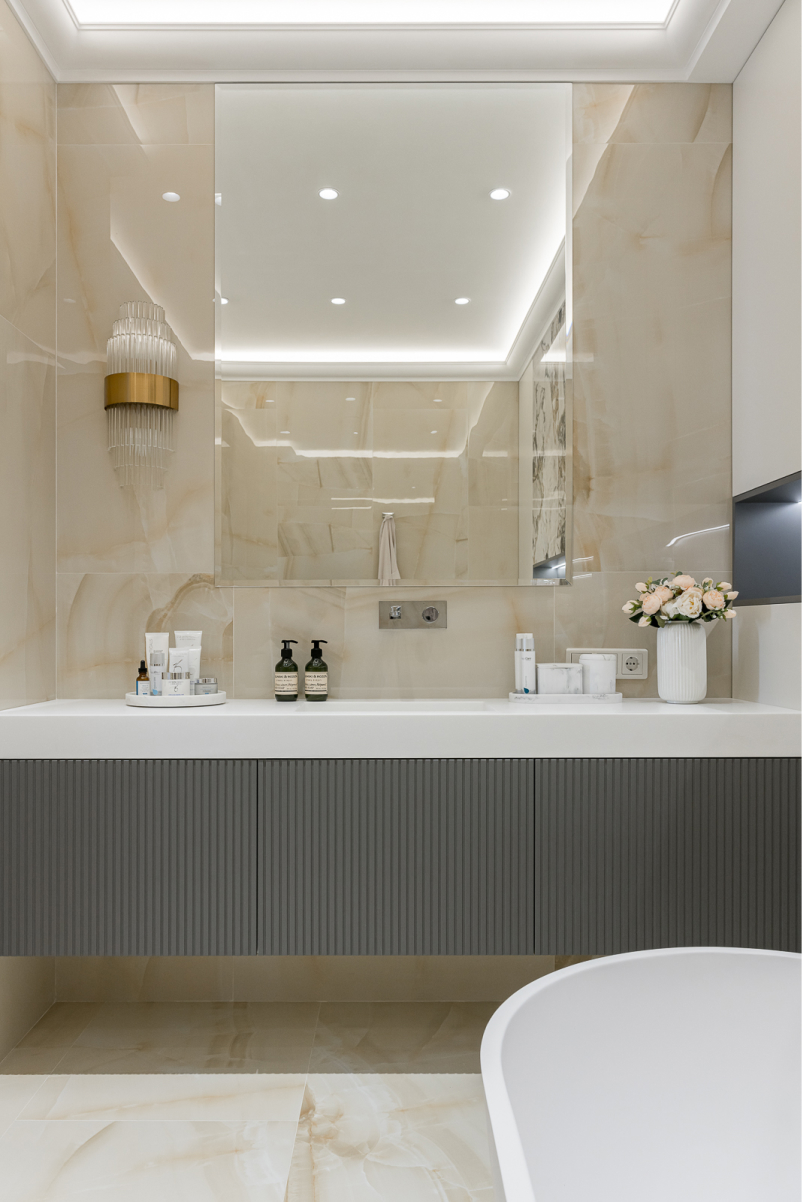 Светлая интегрированная мойка в ванной - очень эстетичное и функциональное решение. Такие раковины визуально кажутся единой конструкцией со столешницей, так как при сборке не формируются бортики, не видны швы и переходы
