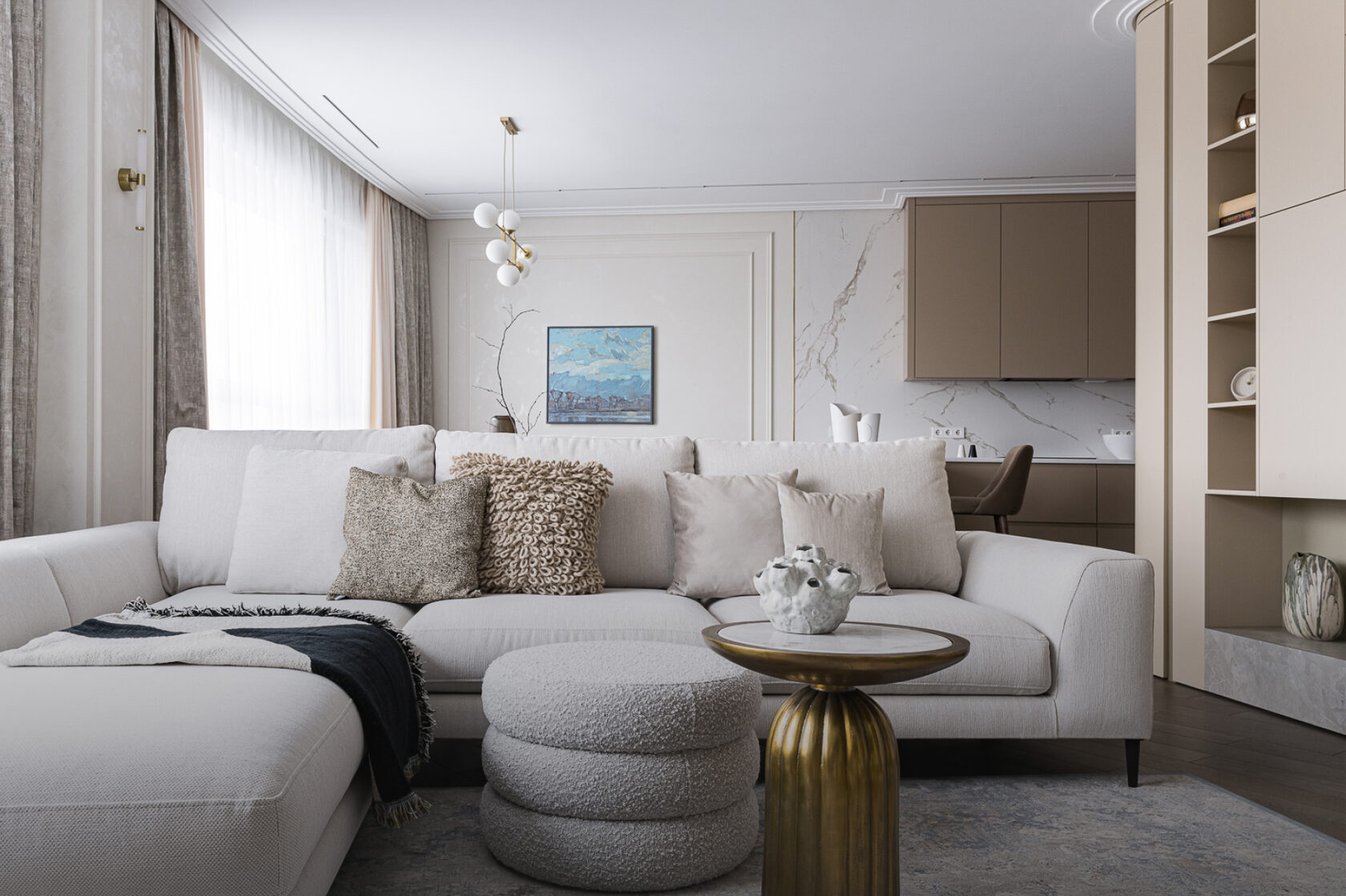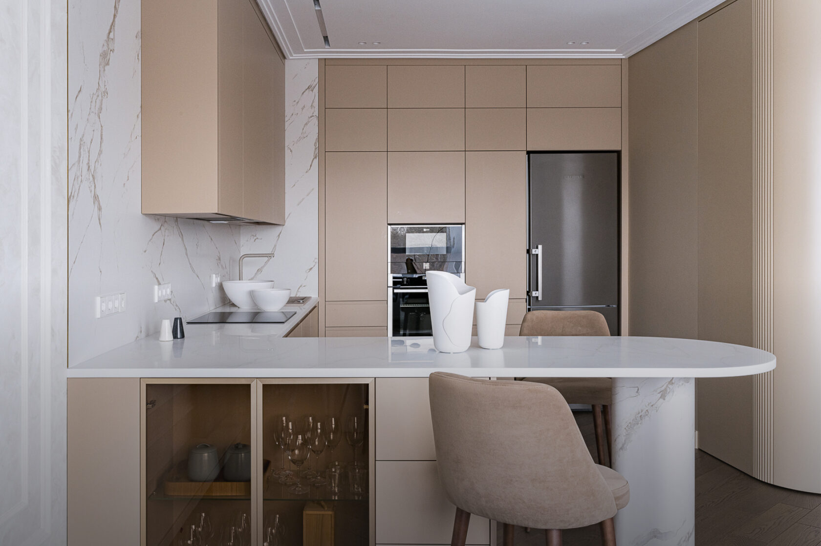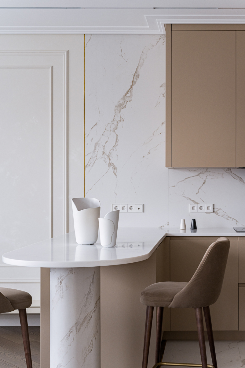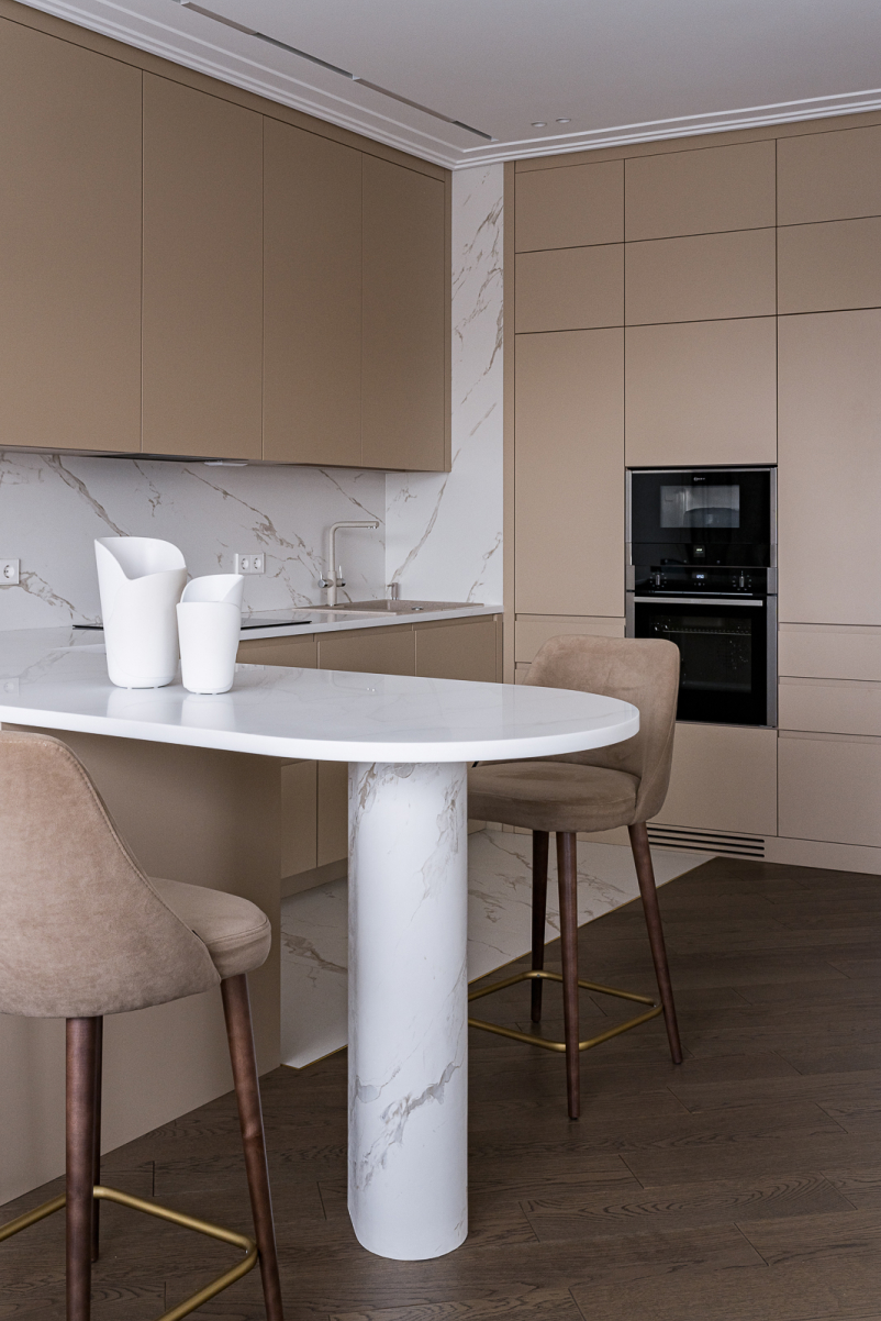 Фасады пеналов и шкафов окрашены в матовую эмаль, а светлая столешница из искусственного камня объединяет все детали, делая пространство этой важной зоны гармоничным