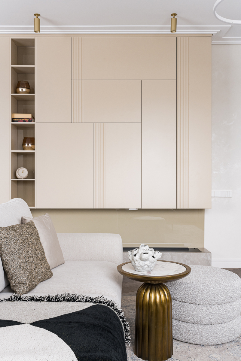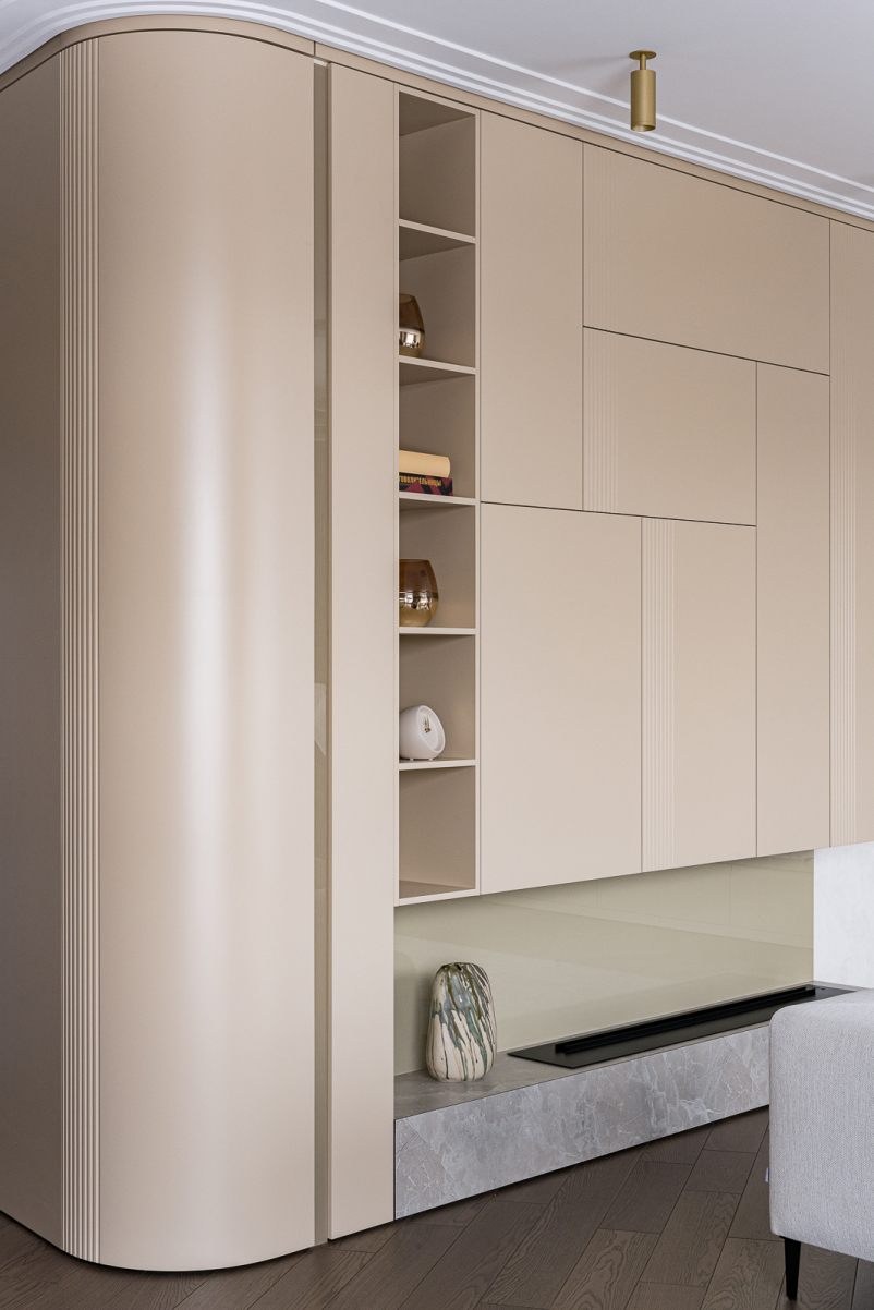 В зоне хранения расположился большой шкаф с матовыми фрезерованными фасадами, которые расположены согласно дизайн-проекту SWITCH