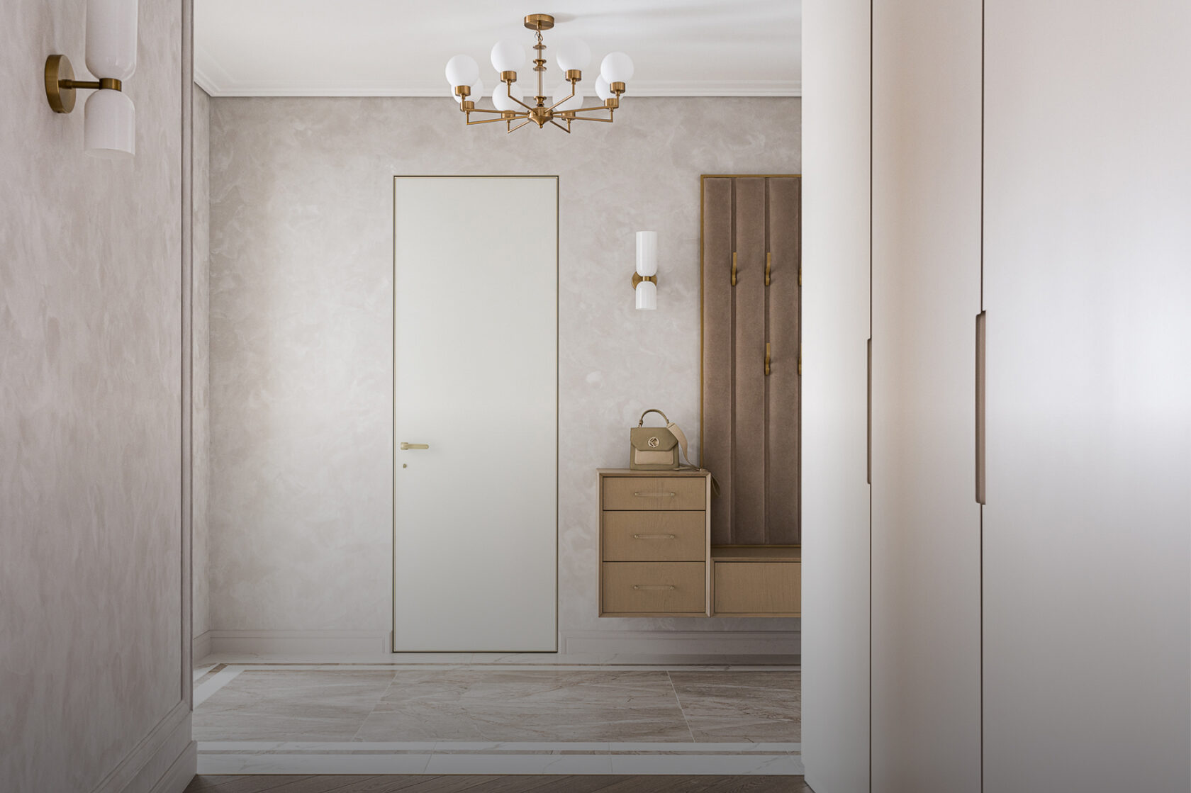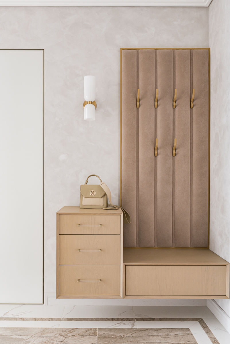 В зоне прихожей установлена мягкая панель с металлической облицовкой и шпонированная тумба с выдвижными ящиками