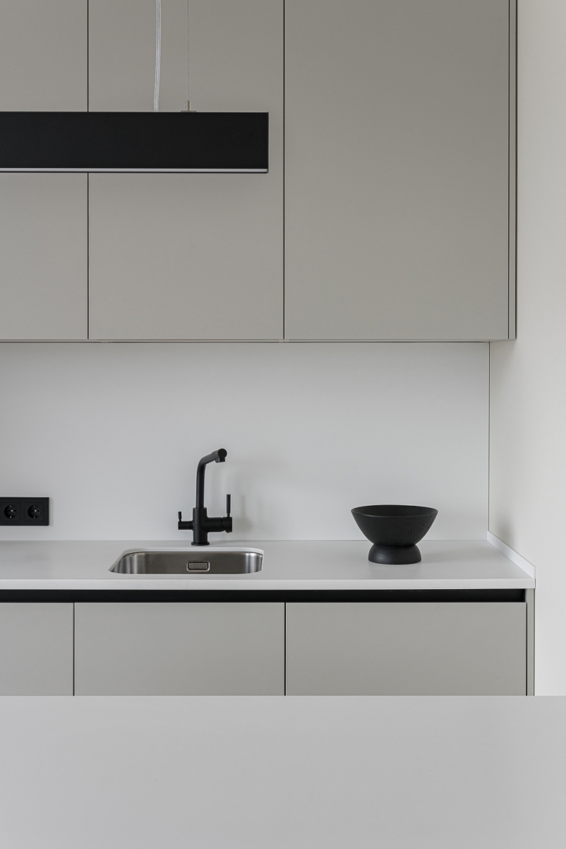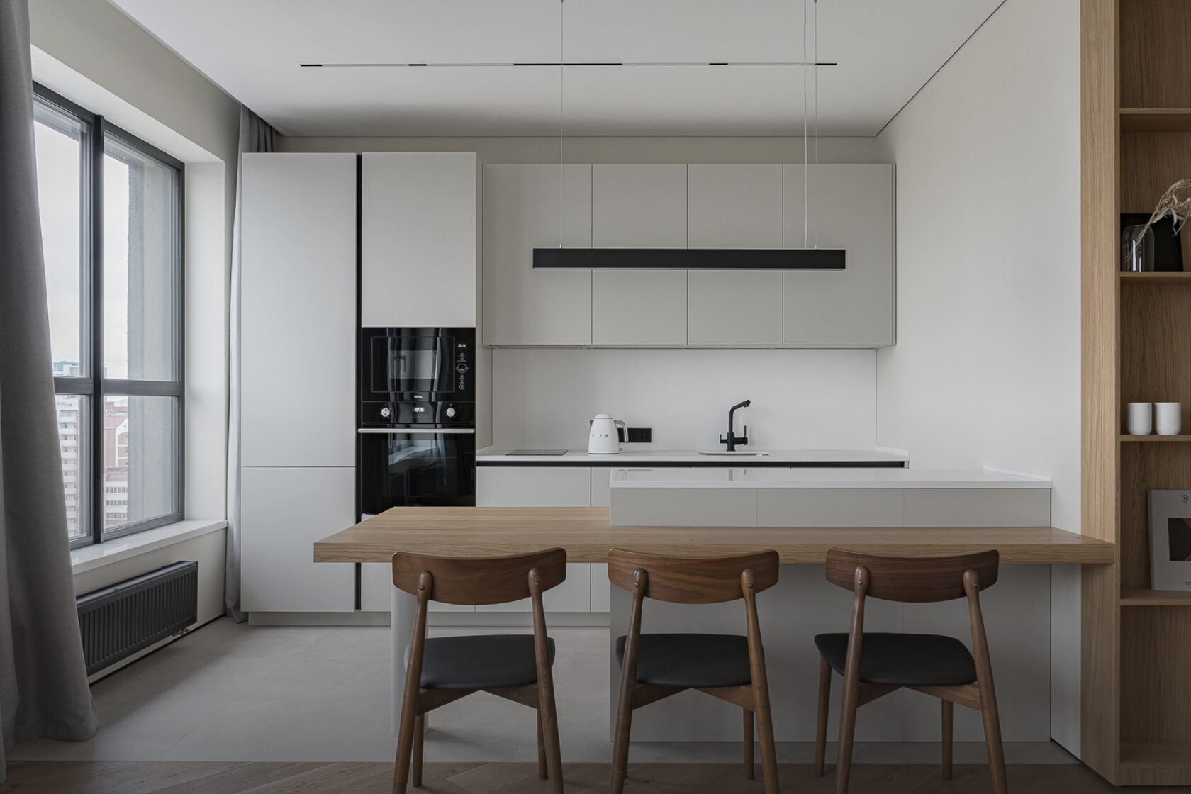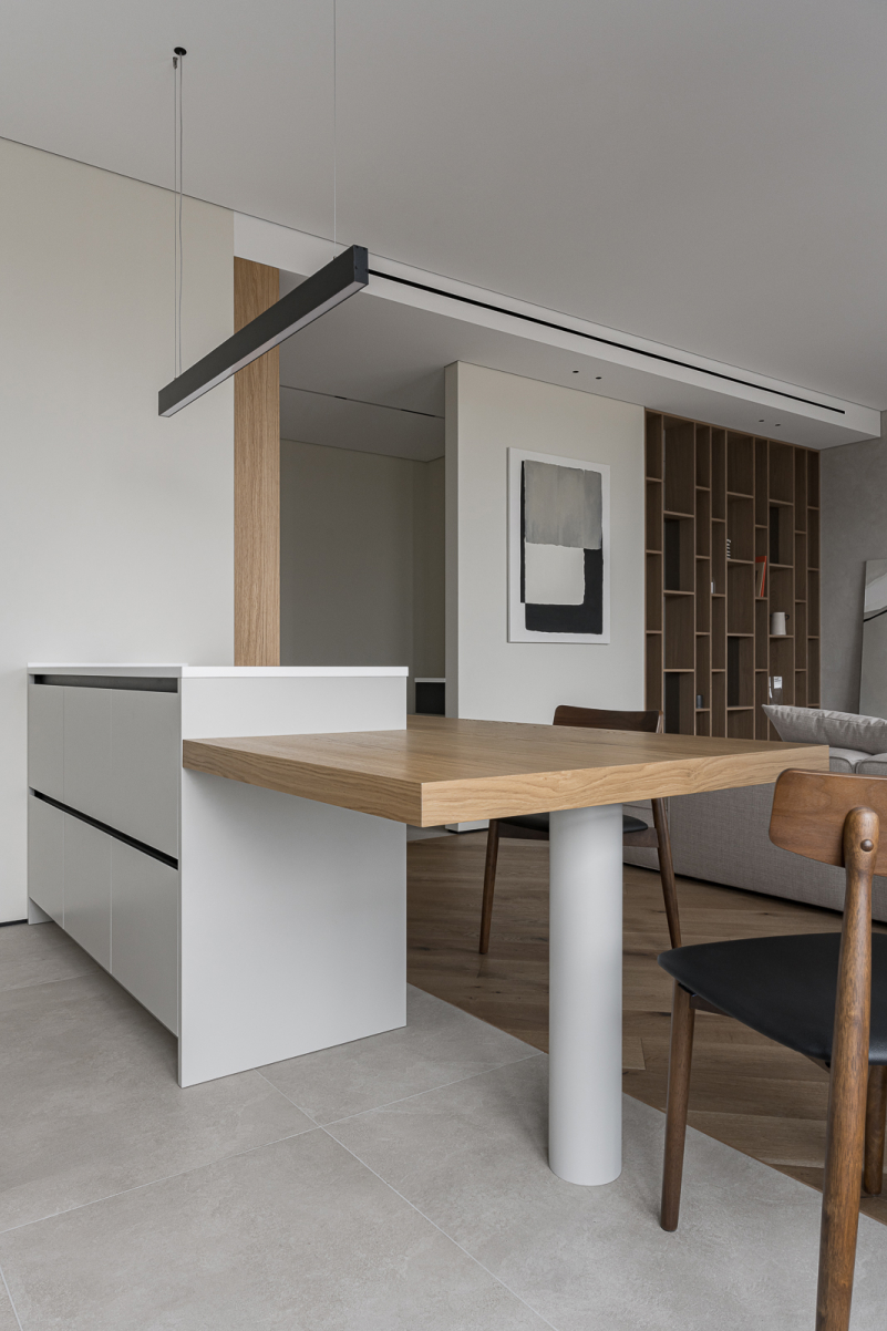 Основная часть с зоной хранения и техникой - МДФ в матовой эмали Фасады острова в матовой эмали, столешница из искусственного камня, обеденный стол в шпоне Дуба