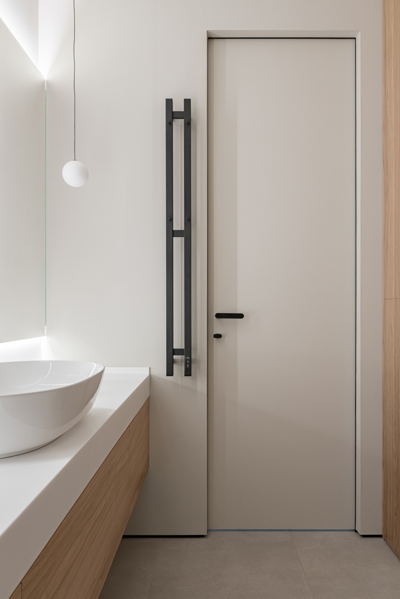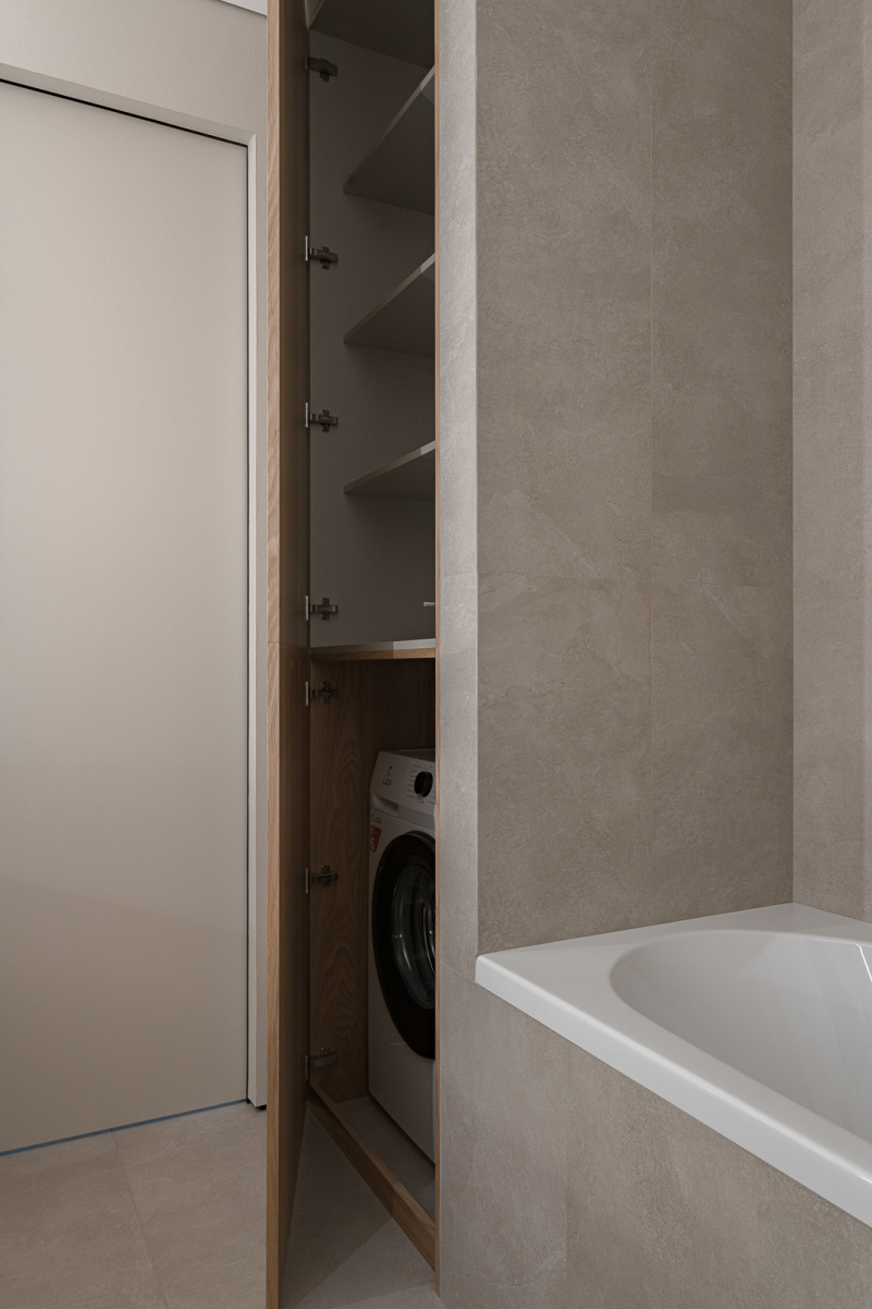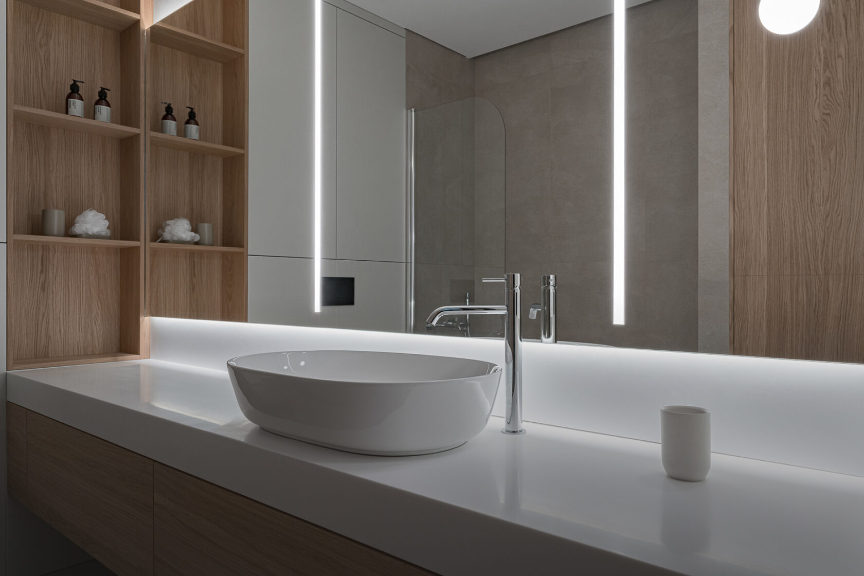 Шкаф и панели в ванной выполнены из МДФ в матовой эмали. Большая столешница из искусственного камня с подвесной тумбой с вместительными выдвижными ящиками из МДФ в шпоне Дуба и накладной раковиной