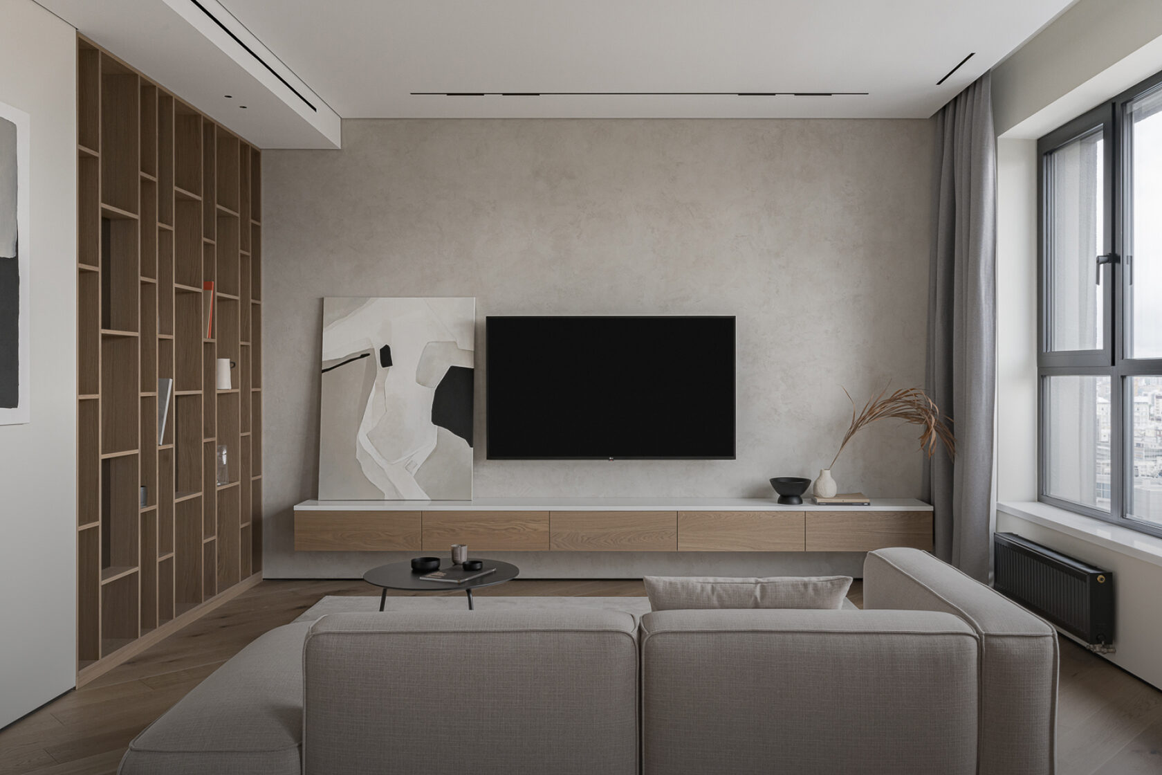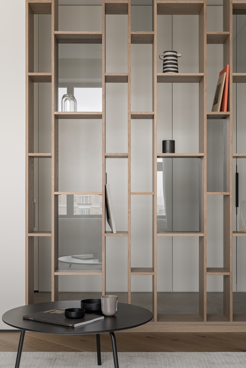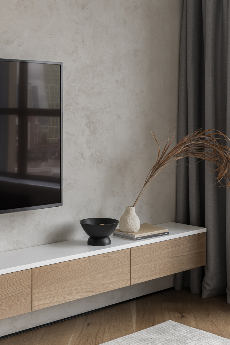 Коридорную часть от зоны гостиной отделяет глухая перегородка и стеллаж из МДФ в шпоне Дуба Некоторые ячейки в стеллаже заполнены стеклянными вставками. Консольная полка в ТВ-Зоне выполнена из МДФ в шпоне Дуба с столешницей из искусственного камня