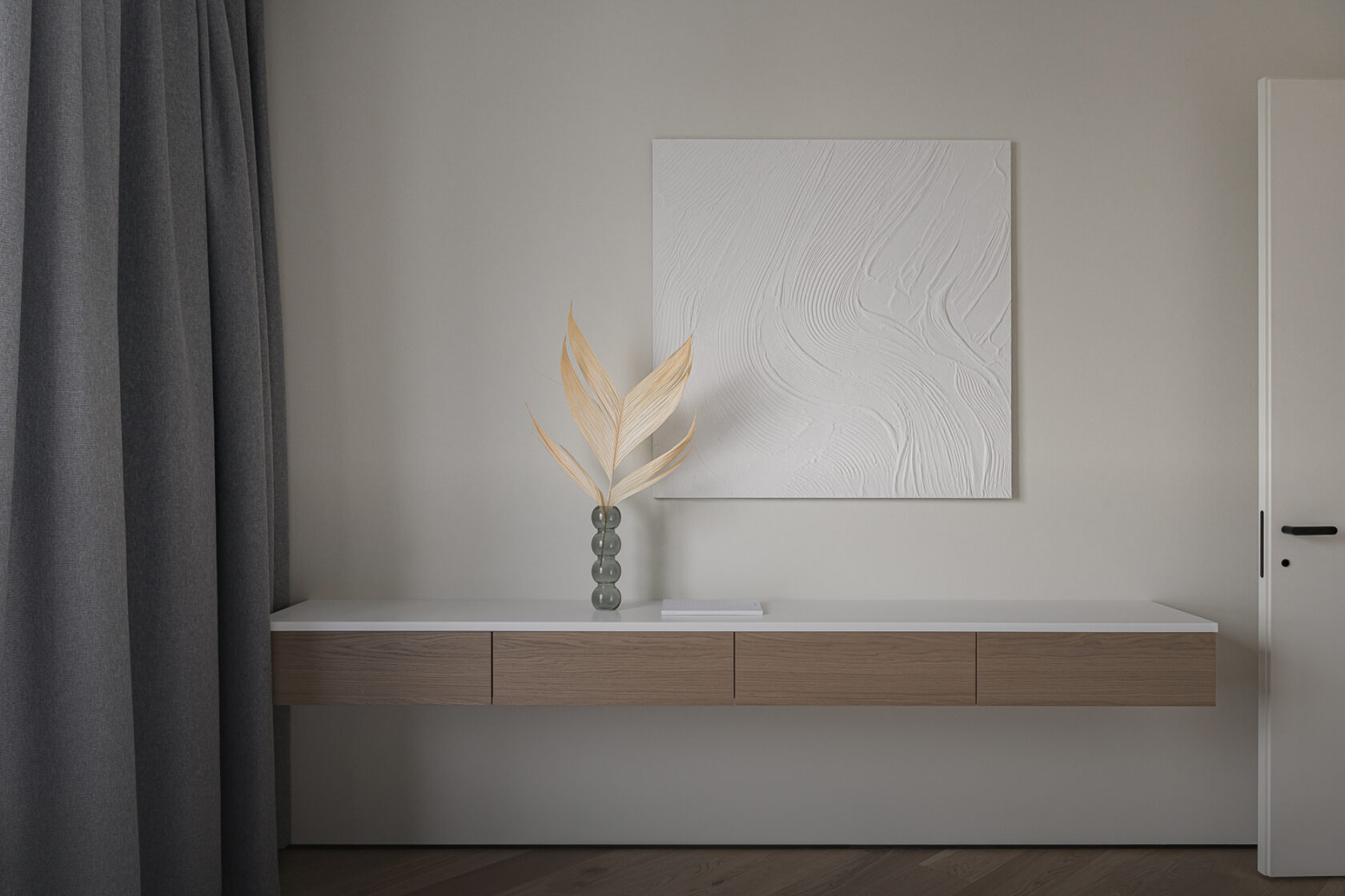 Напротив кровати - длинная консоль в шпоне Дуба со столешницей из искусственного камня Кровать - One Mebel, у изголовья - рельефные панели Orac Decor