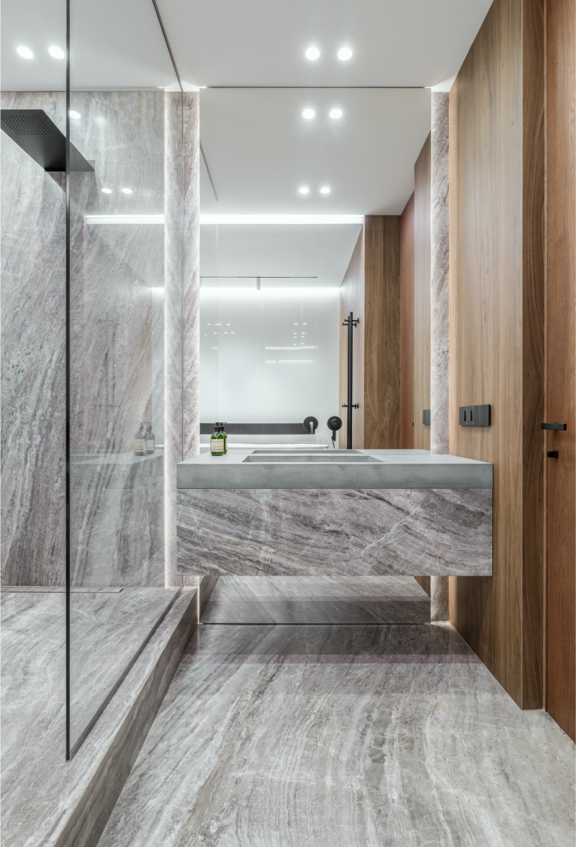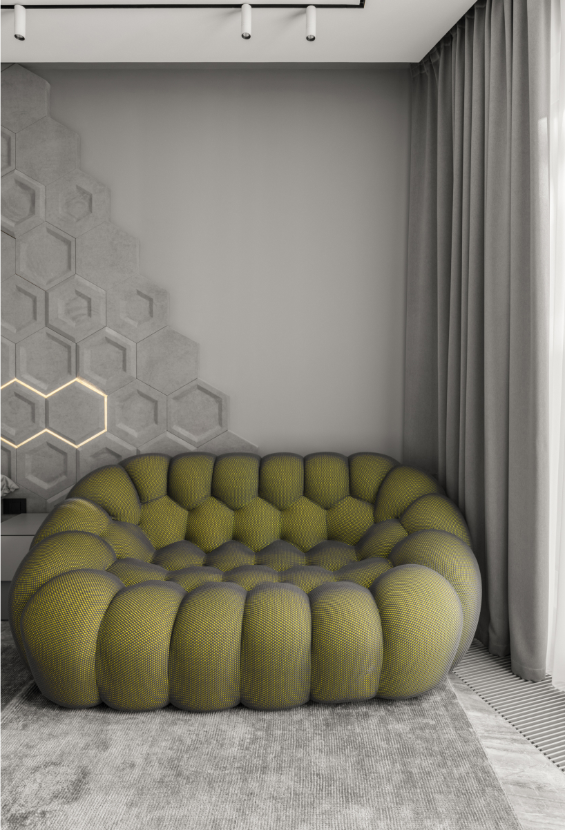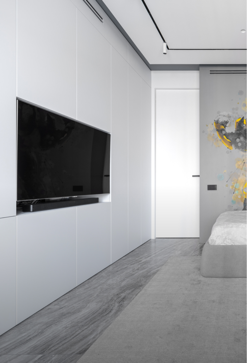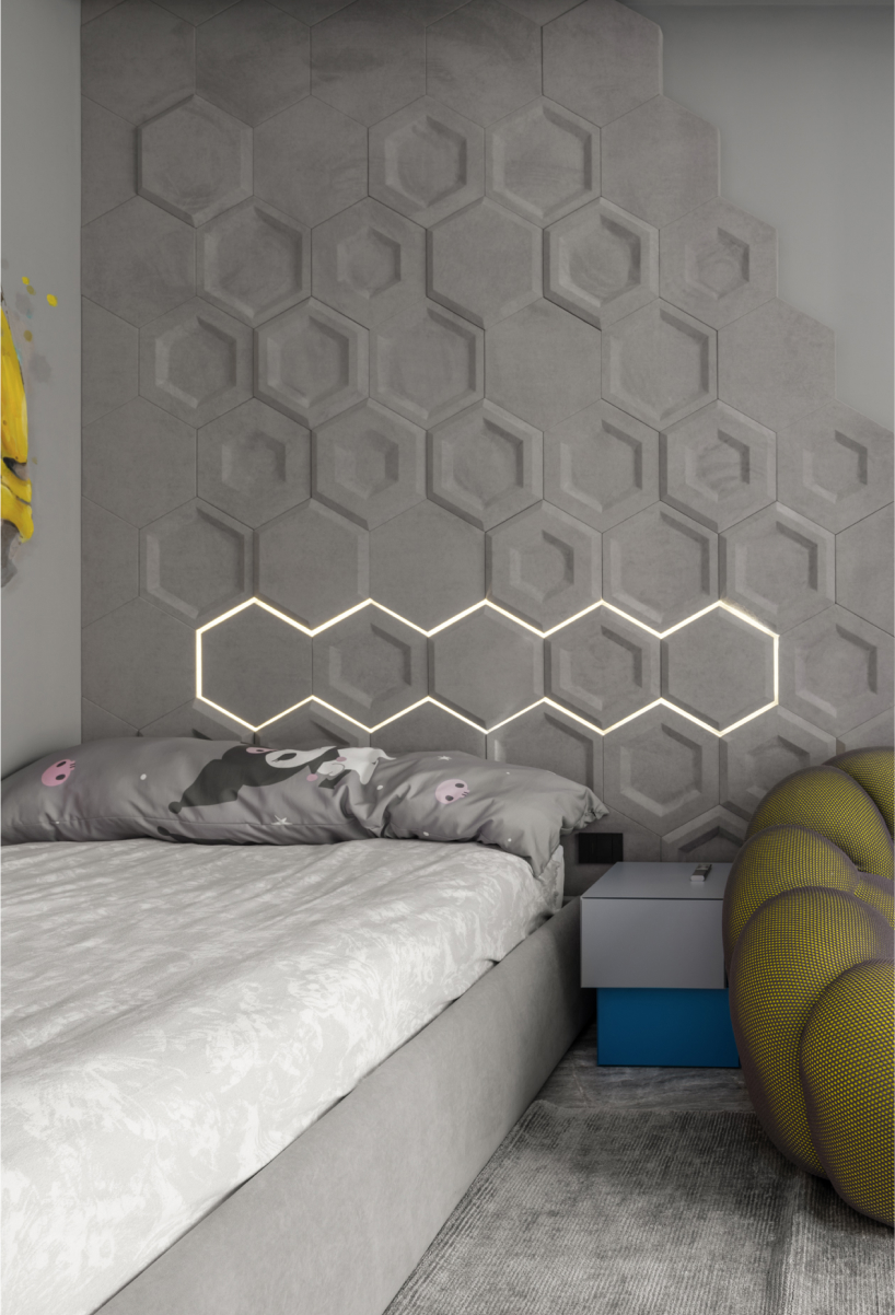 Настенные панели - фрезерованные согласно эскизам дизайнера МДФ разной толщины обтянуты тканью - ряд ячеек над кроватью имеют контурную подсветку.