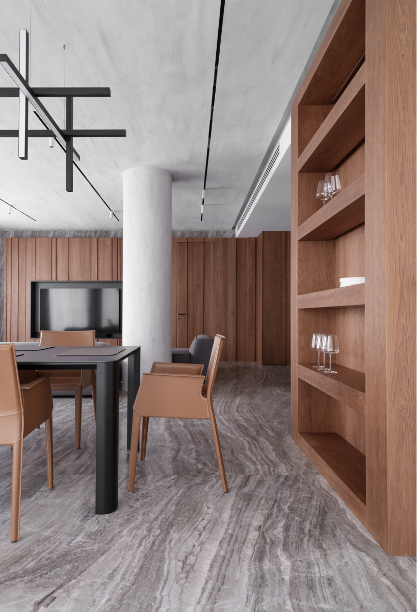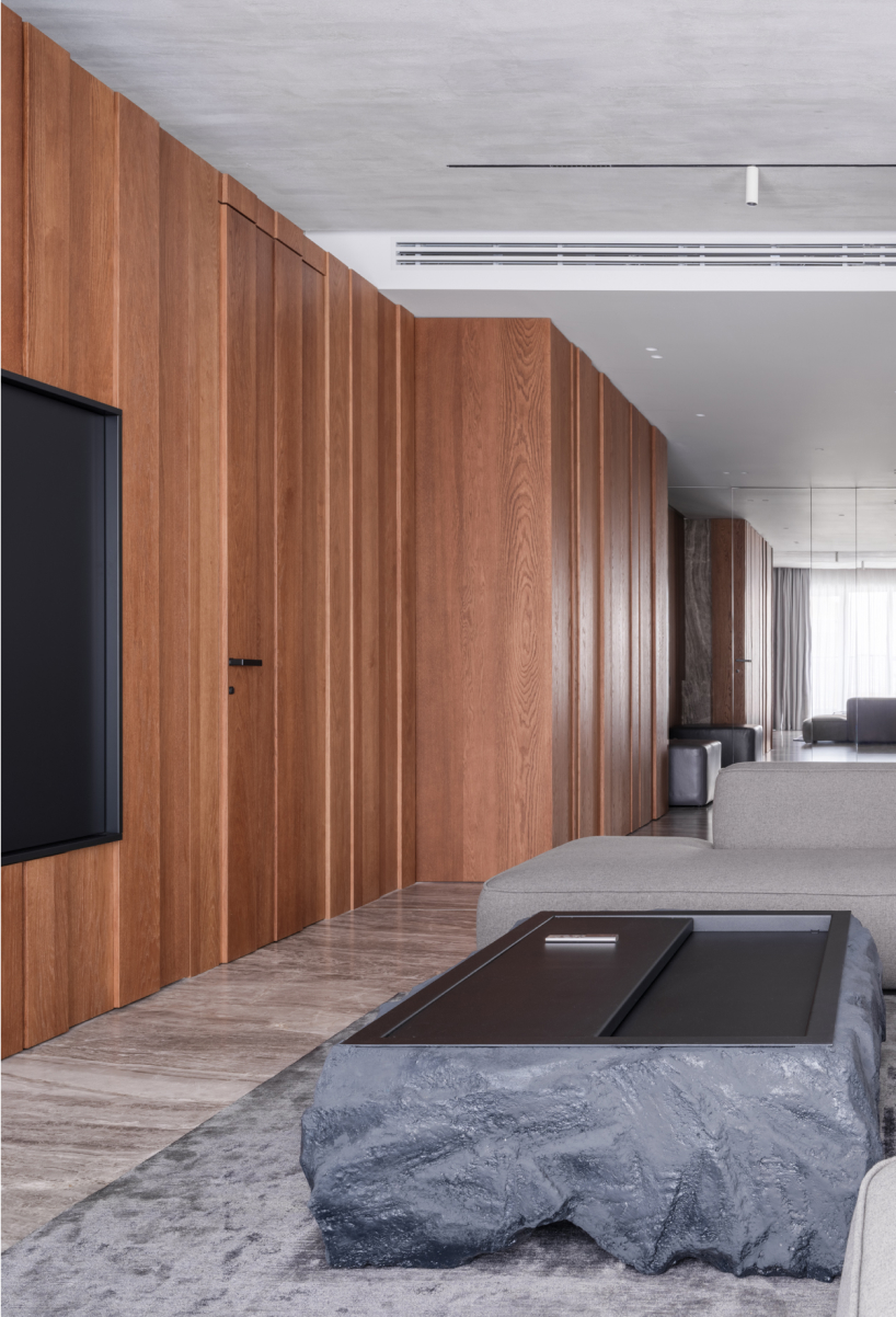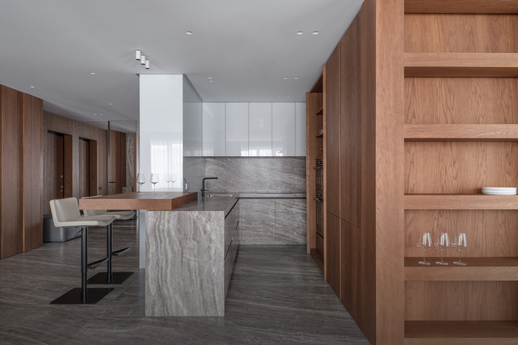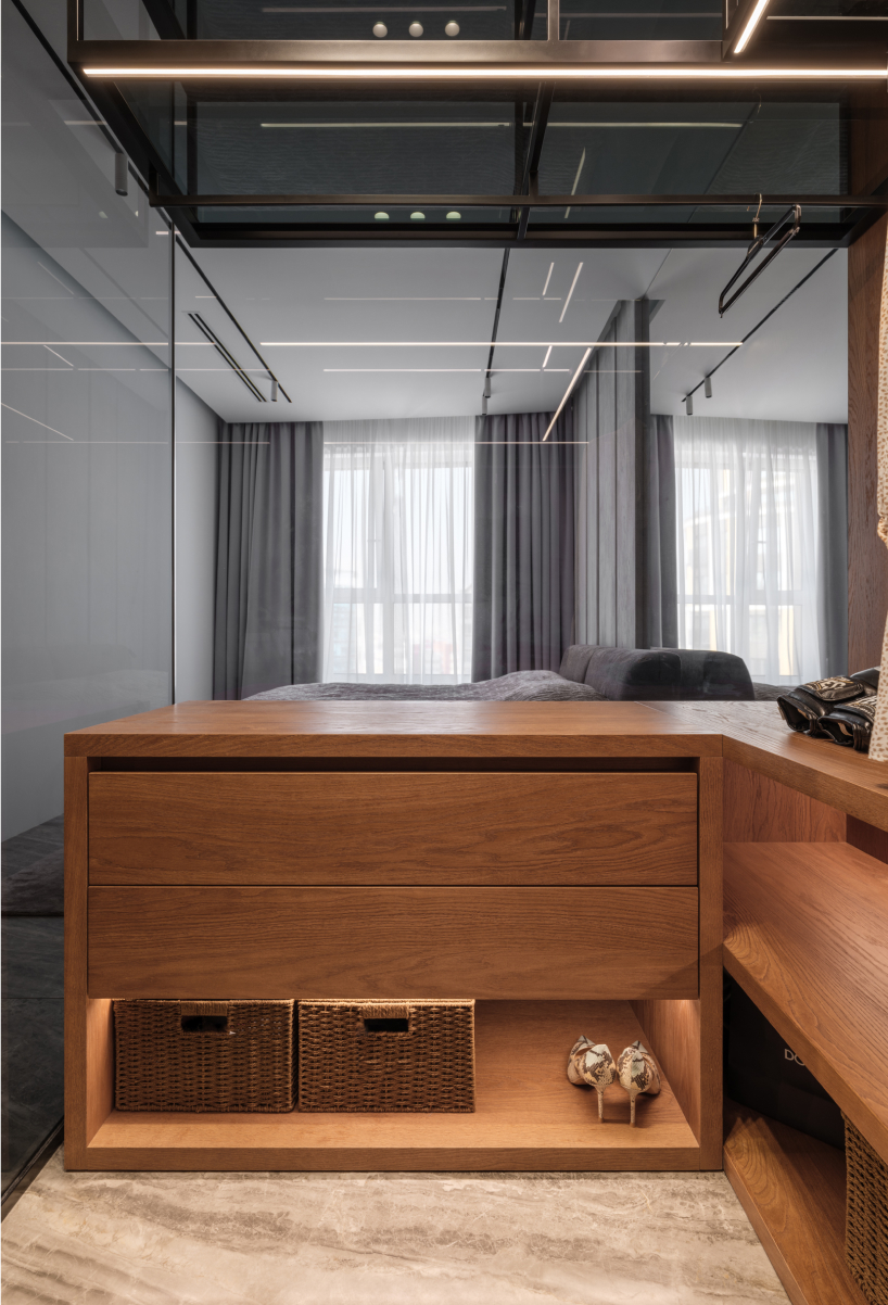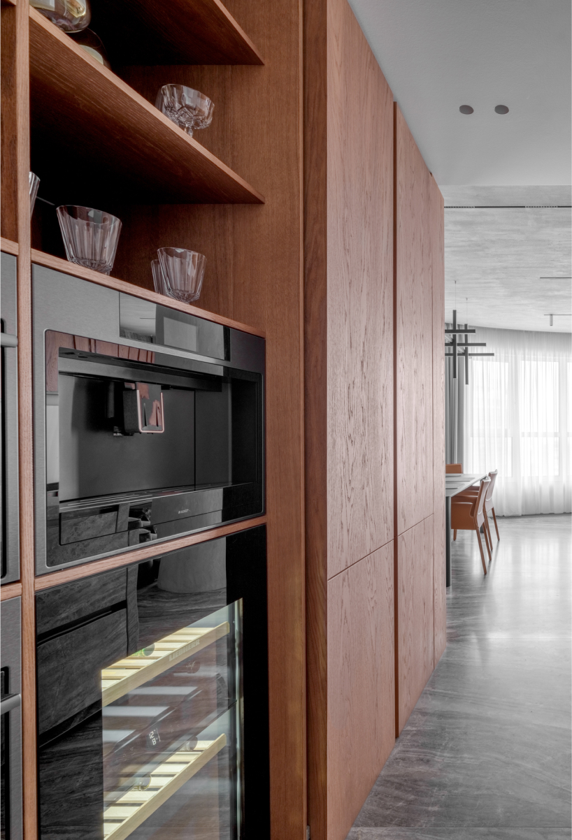 Пенальная часть полностью изготовлена в шпоне Дуба. Открывание фасадов производится за счет поворотно-сдвижной системы Concepta