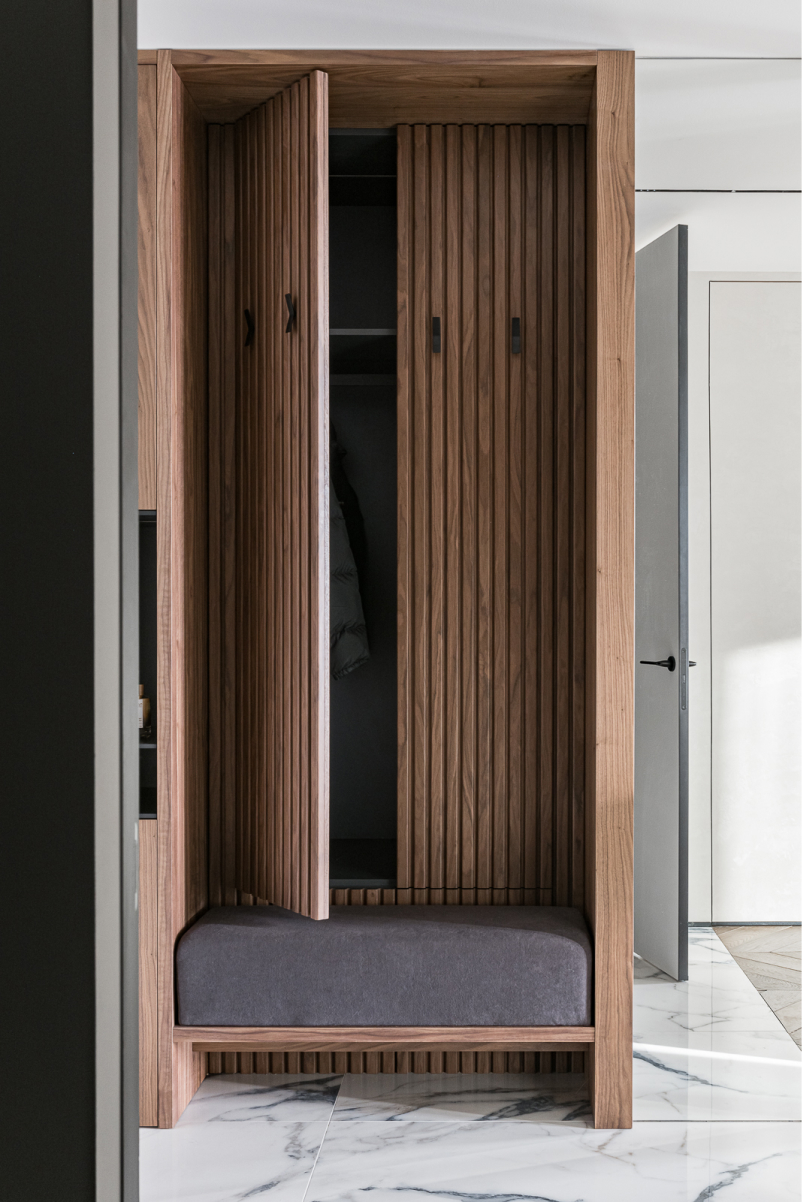 За реечными фасадами скрыто дополнительное пространство для хранения На самих фасадах установлены ручки, за них осуществляется открывание. Внутри установлена штанга под одежду