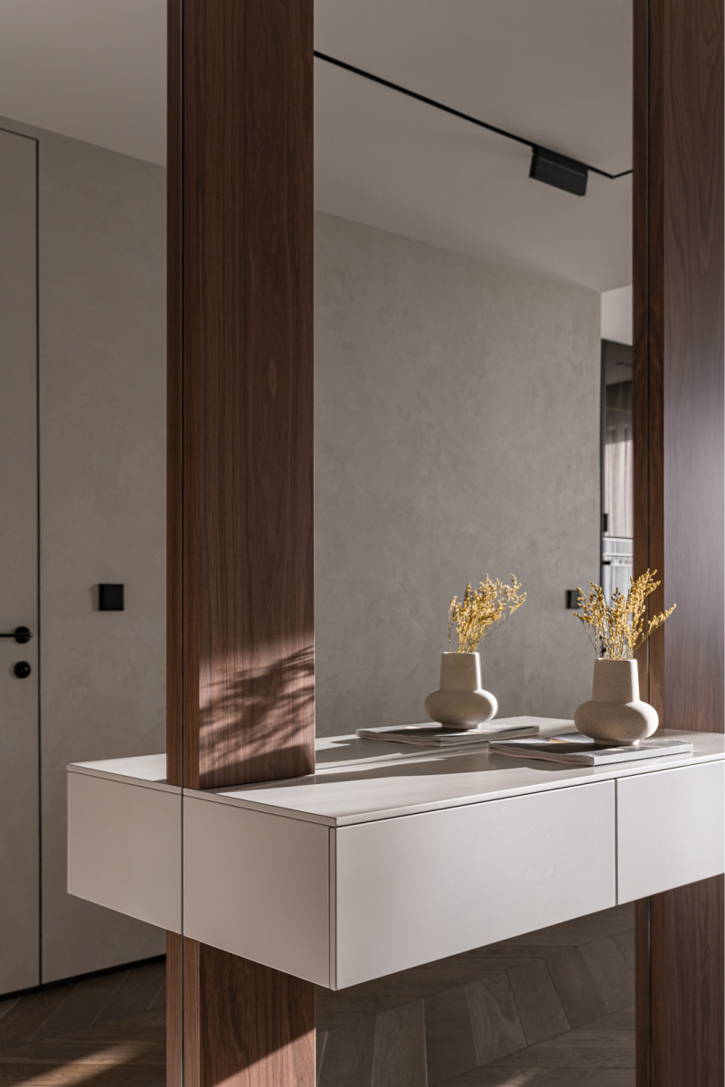 Консоль выполнена из МДФ в матовой эмали. В ней можно хранить важные мелочи, а сверху расположить небольшие элементы декора
