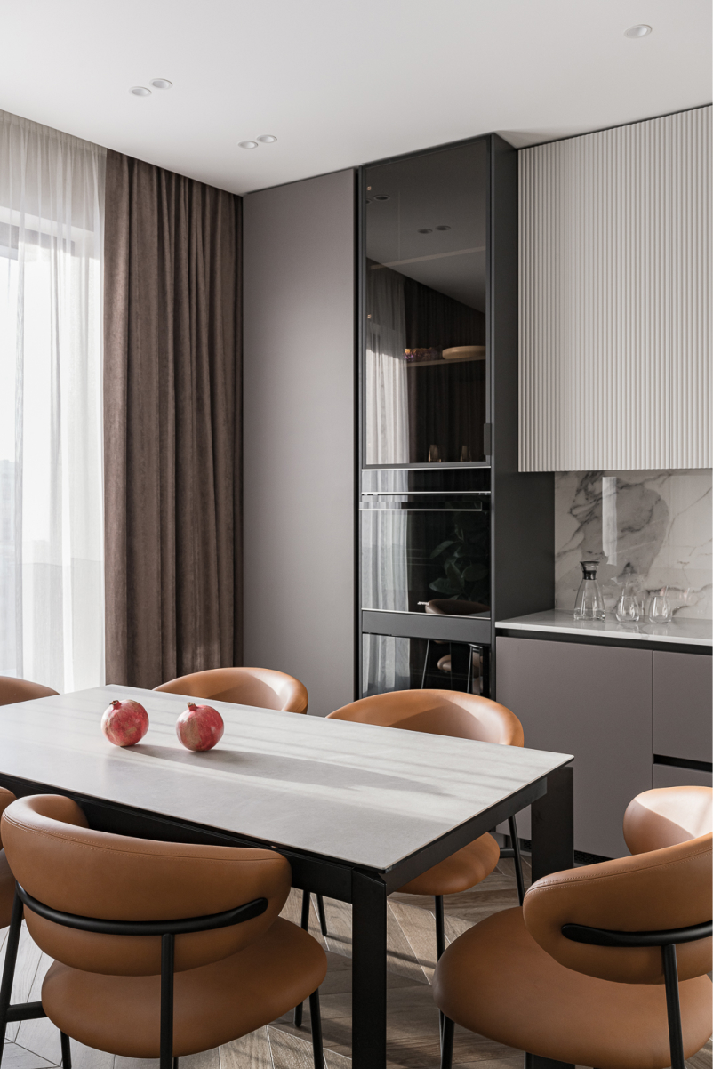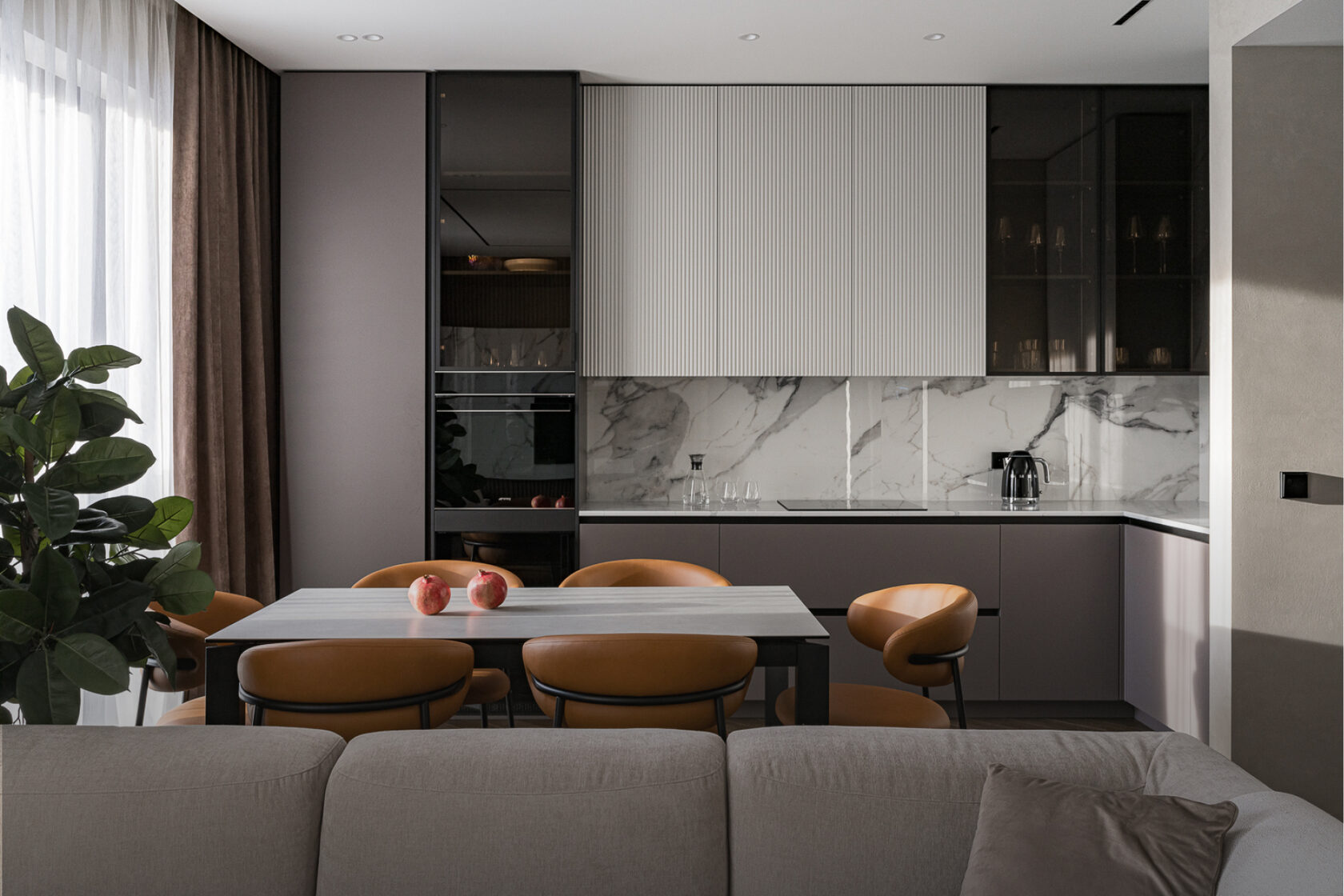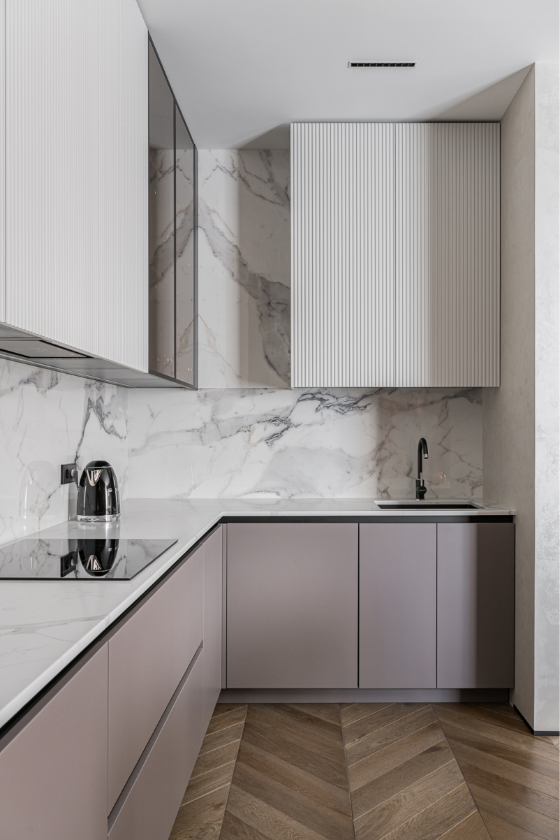 Нижние фасады из МДФ окрашены с двух сторон матовой эмалью. Столешница из кварцевого агломерата