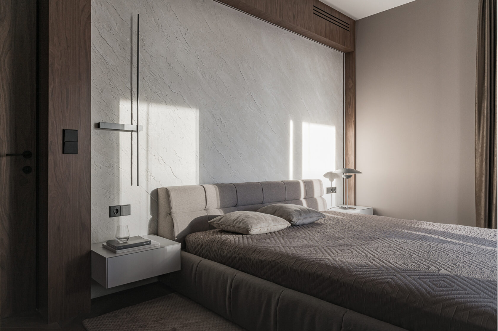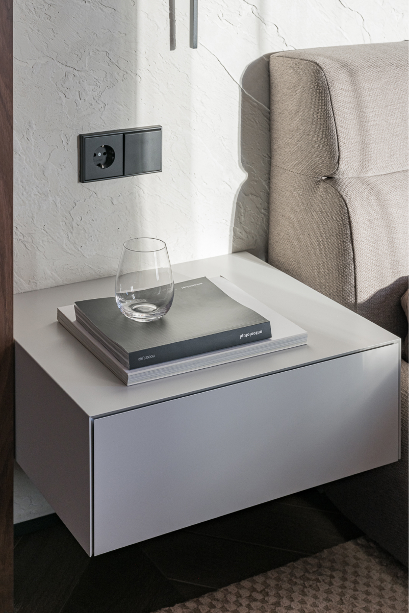 Прикроватные тумбы из МДФ в матовой эмали. На торцах фасадов выполнена фрезеровка в виду скоса под 45 градусов - идентично торцам корпуса, к которым он примыкает
