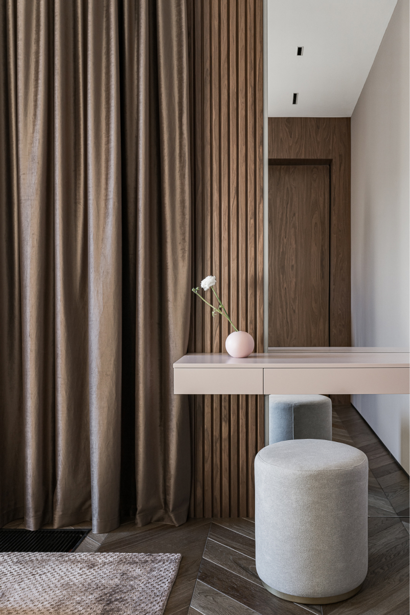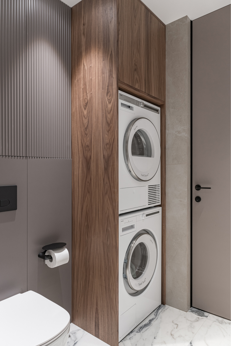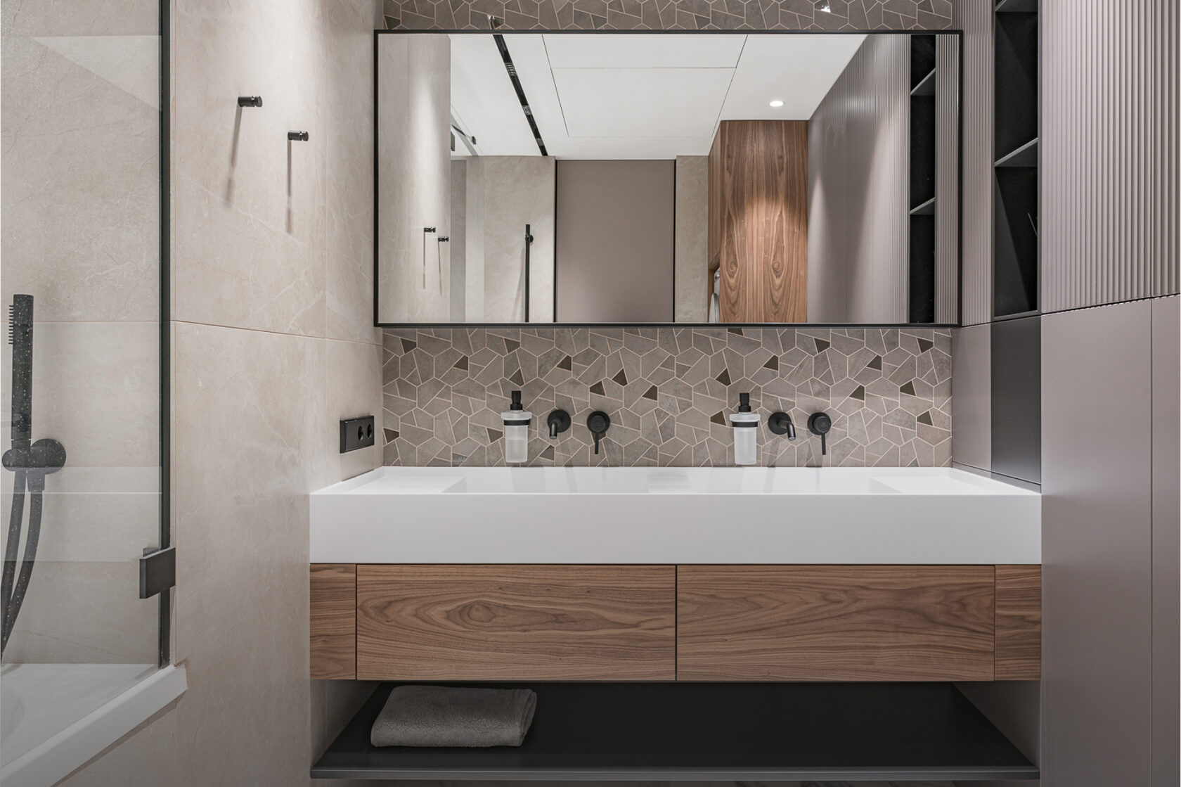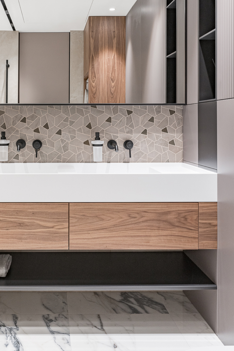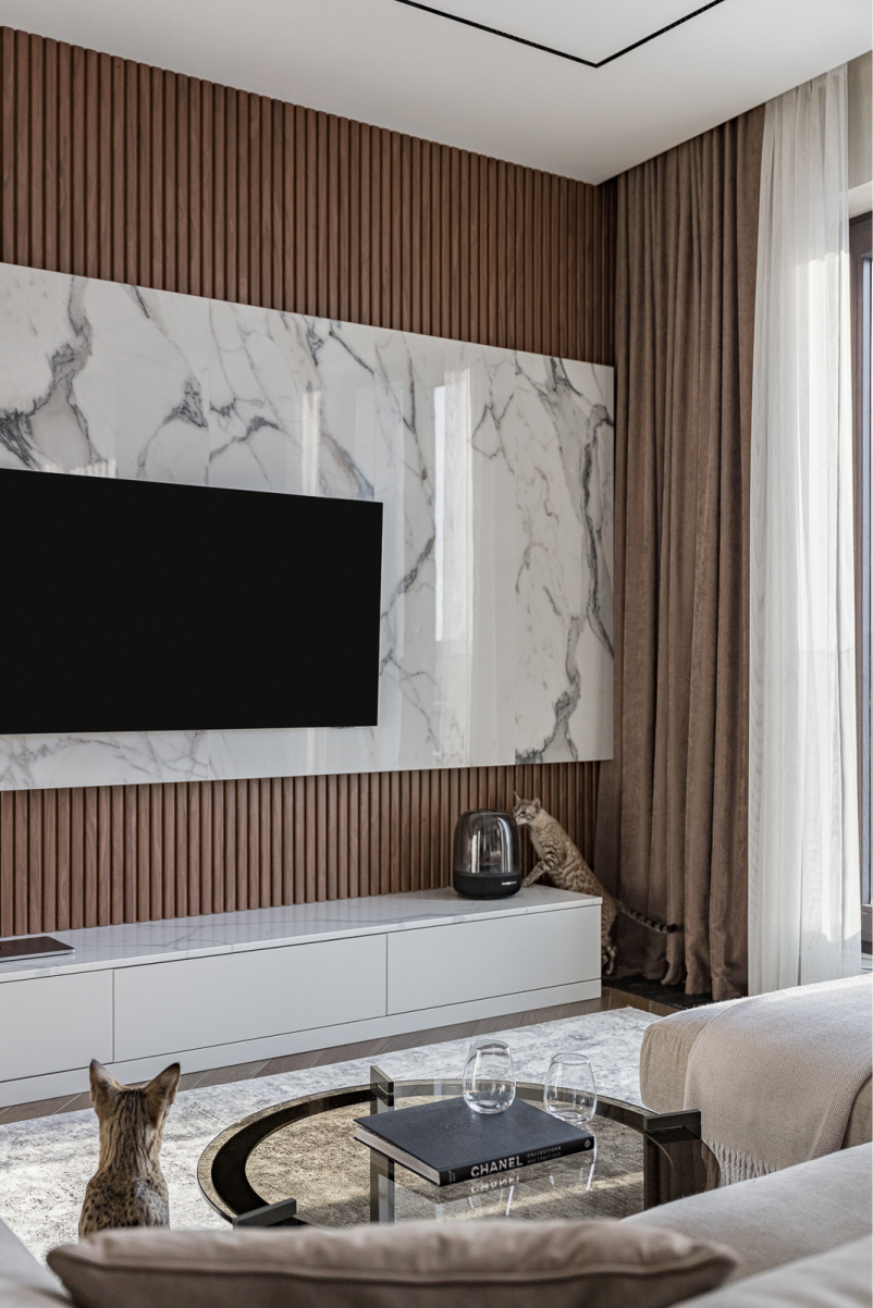 Фасады тумбы под ТВ сделаны из МДФ в матовой эмали с столешницей из кварцевого агломерата