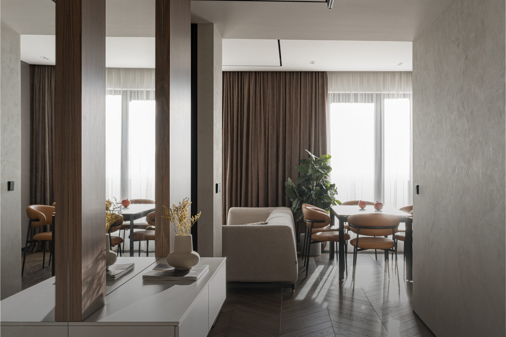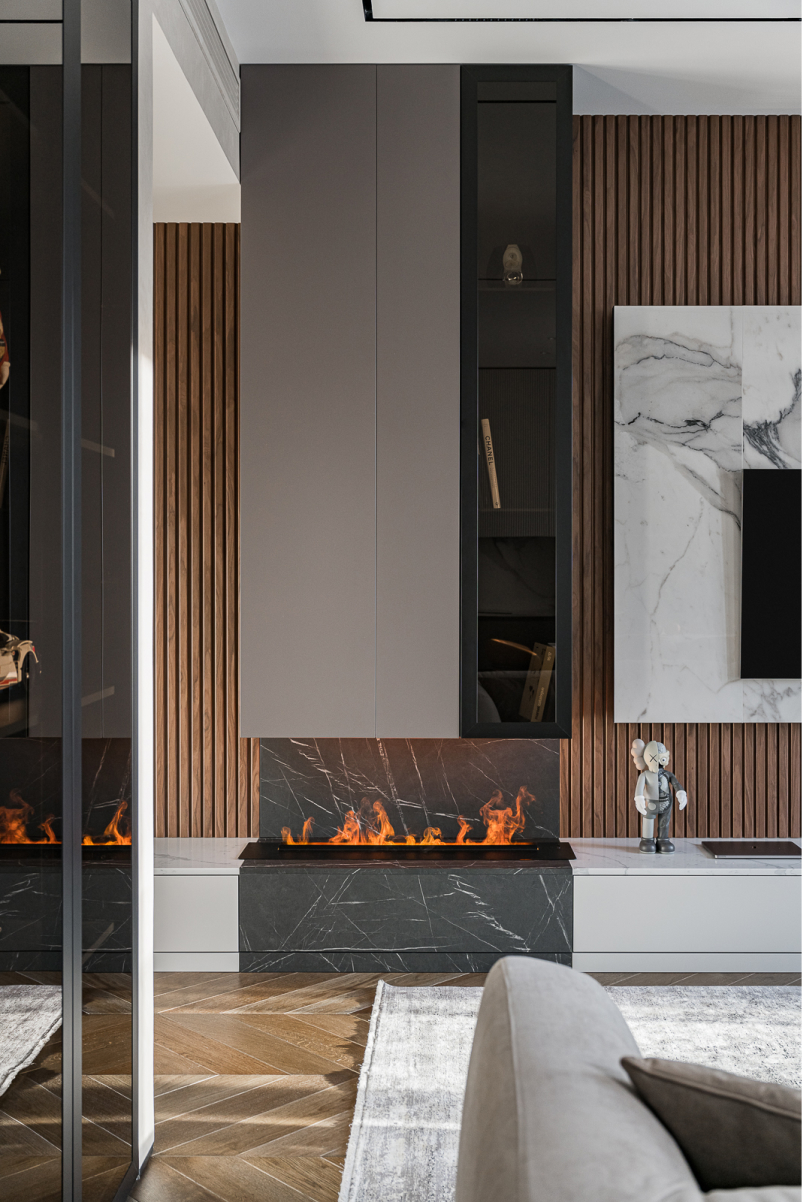 Для ТВ-зоны мы изготовили подвесные шкафы из МДФ и тонированного под бронзу стекла в черном профиле