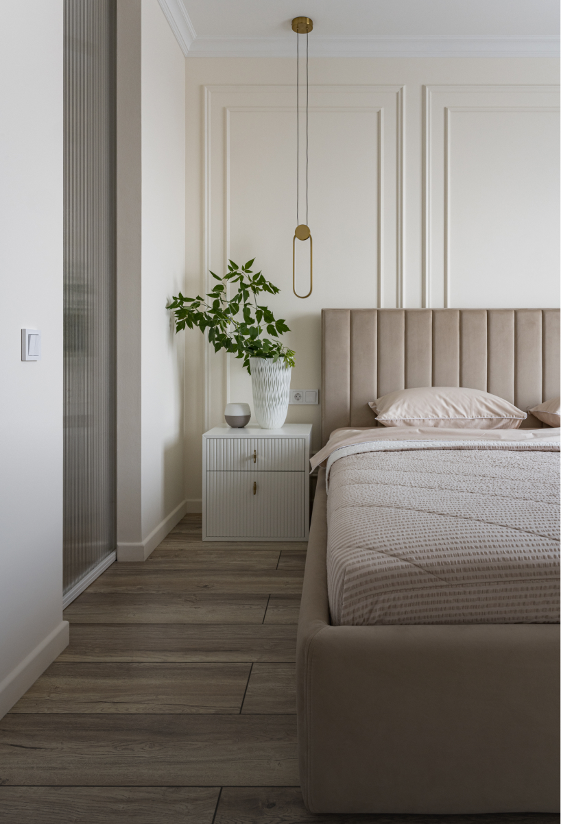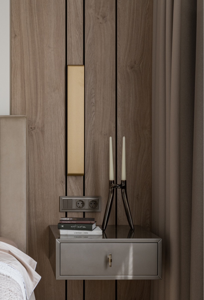 Справа от кровати установлены стеновые панели и подвесная тумба с глянцевым покрытием. Корпус тумбы выполнен с запилом под 45° с видимым стыком