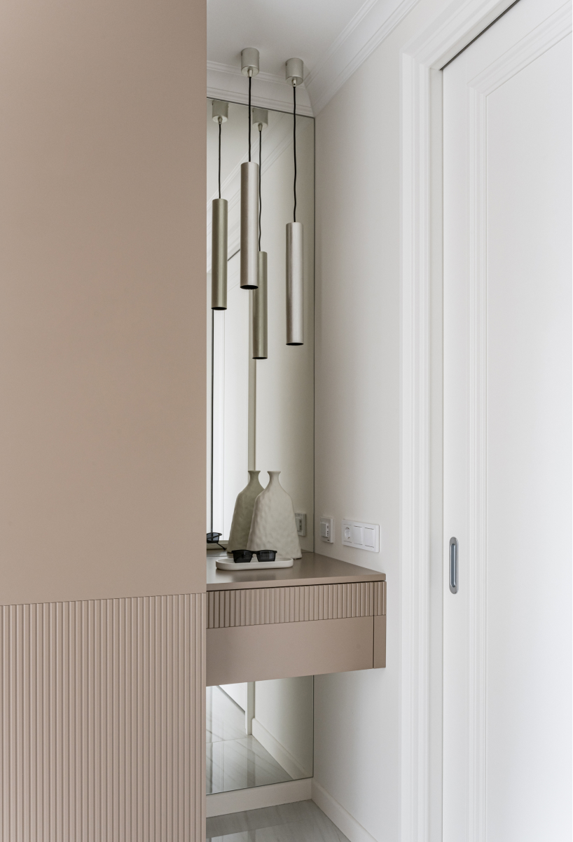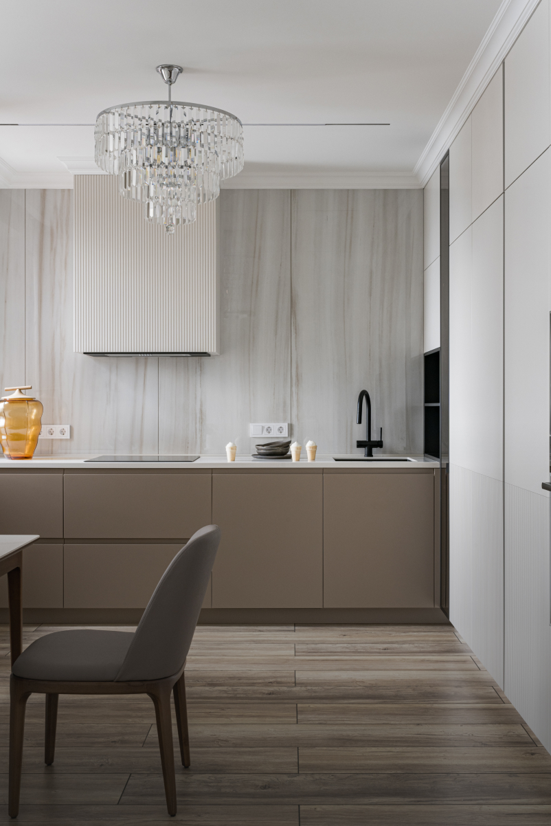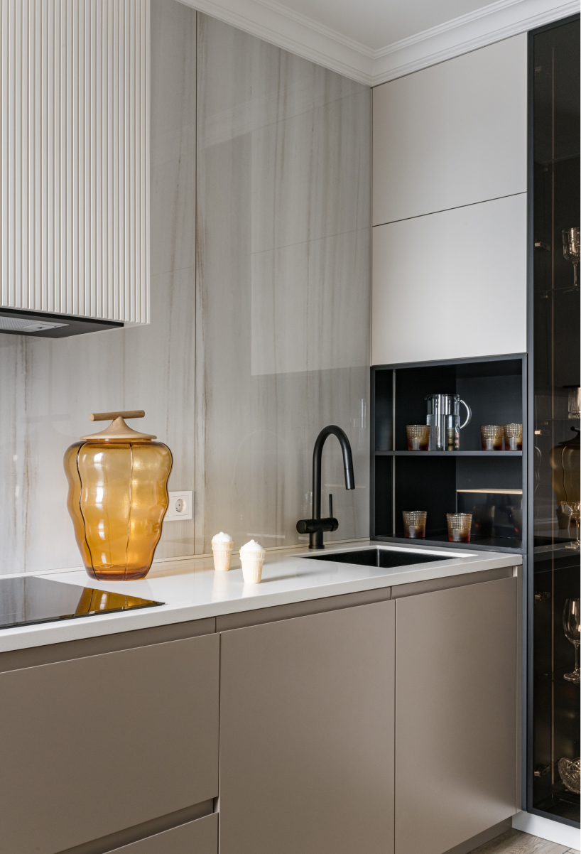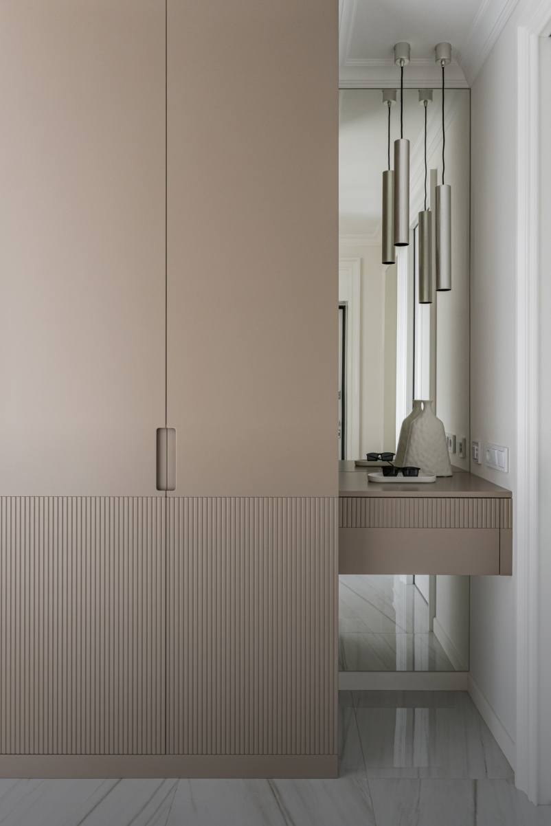 Фасады шкафа выполнены в матовой эмали с индивидуальной фрезеровкой и интегрированной вертикальной ручкой