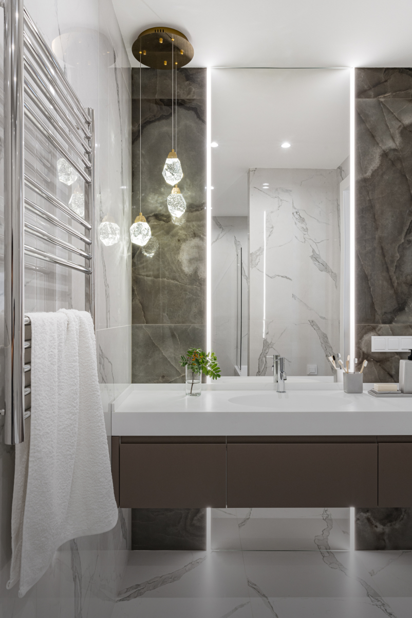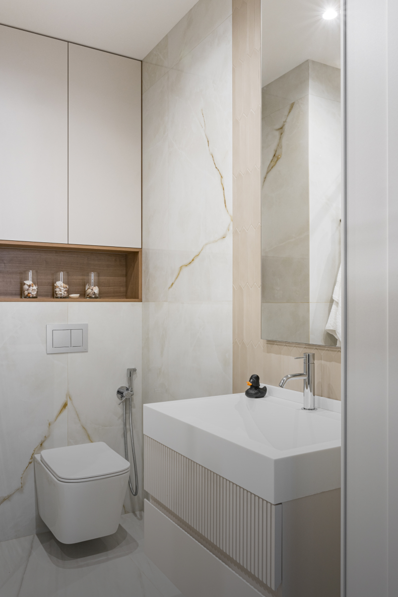 Фасады шкафа над инсталляцией выполнены в матовой эмали, а открытая ниша и корпус из EGGER