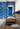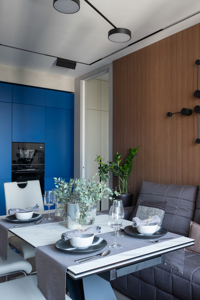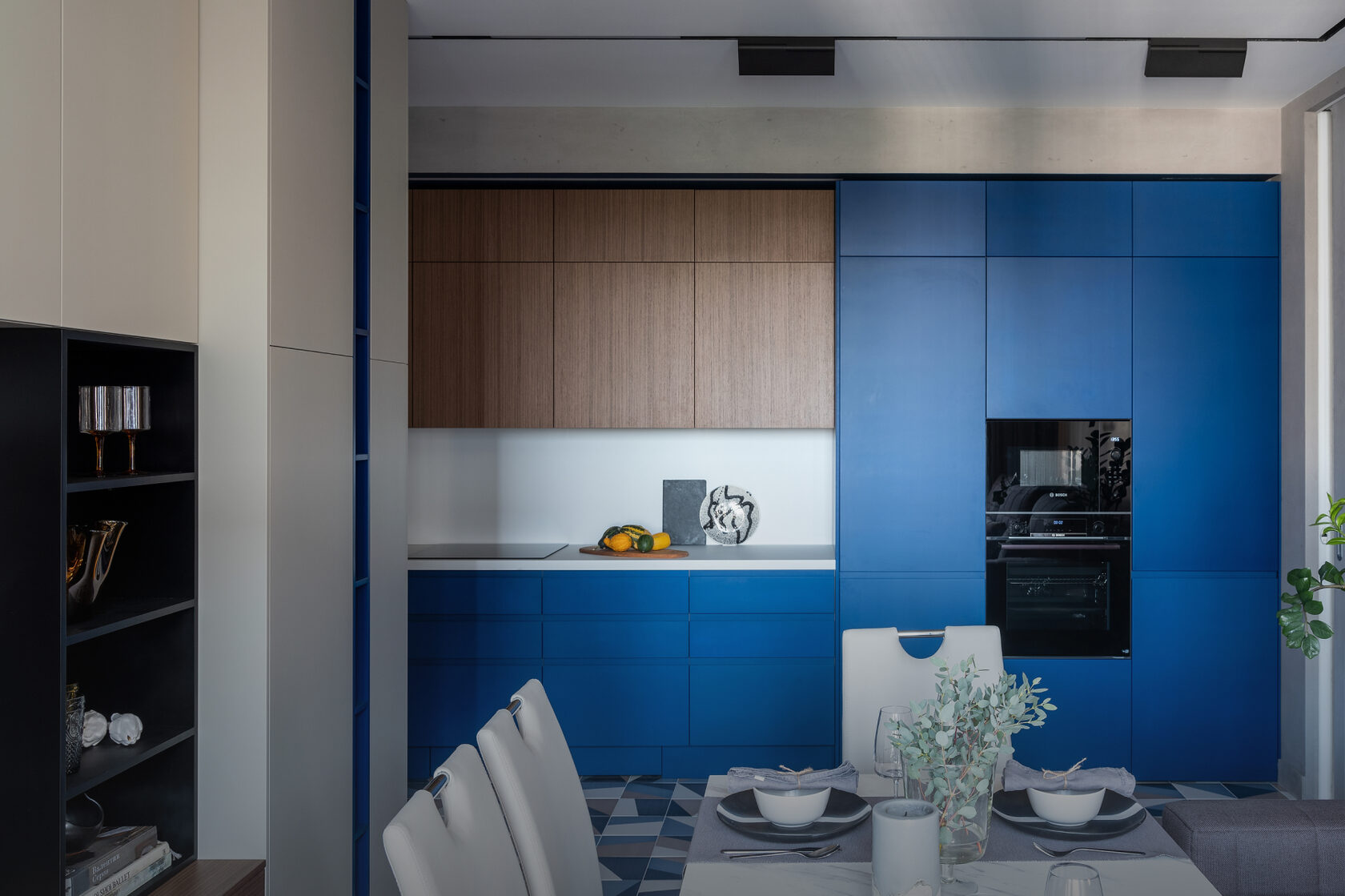 Интересное цветовое решение для кухни-гостиной — акцентное синее пятно фасадов кухни, белые вставки и светлое дерево