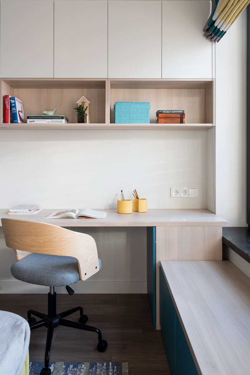 в комнате предусмотрено удобное рабочее место, а также много мест для хранения книг, канцтоваров и прочих важных для учебы и жизни вещей